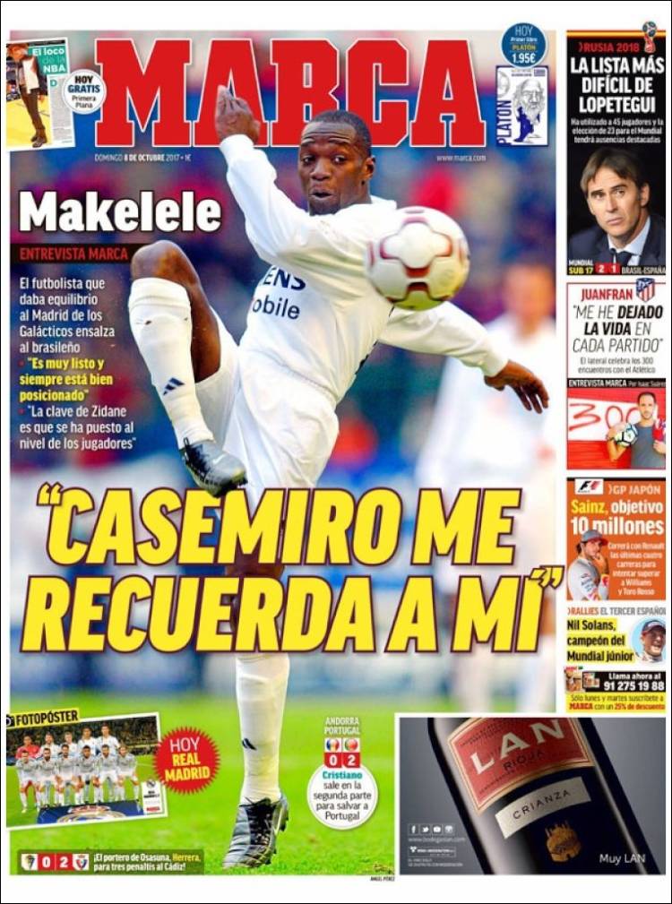 Si hablamos de esto es también porque Makélélé (así, con venga de acentos que gráficamente resultan simbólicos) salta hoy a la portada de Marca. En entrevista exclusiva habla de cosas ajenas a las que audazmente comentábamos, a saber, que Casemiro se parece a él. Cambiamos de tercio y con el debido respeto replicamos a Claude: mira, de otras cosas lo que quieras, pero en esto nos tememos que más quisieras. Makélélé cree estar piropeando a Casemiro al decir que se le parece, pero lo cierto es que se está piropeando a sí mismo. Aunque solo tiene 25 años, el palmarés del brasileño ya da sopas con ondas al del francés, aun siendo éste excelente. Y técnicamente Casemiro es superior. Aunque no dudamos de la buena intención de Makélélé, lo cierto es que no está en disposición de compararse con el tanque de Zidane sin que su declaración se interprete como un acto de arrogancia. Makélélé está en la Historia, ocupando un muy notable puesto en ella. Casemiro es otra cosa. Casemiro ha hecho y hace la Historia.