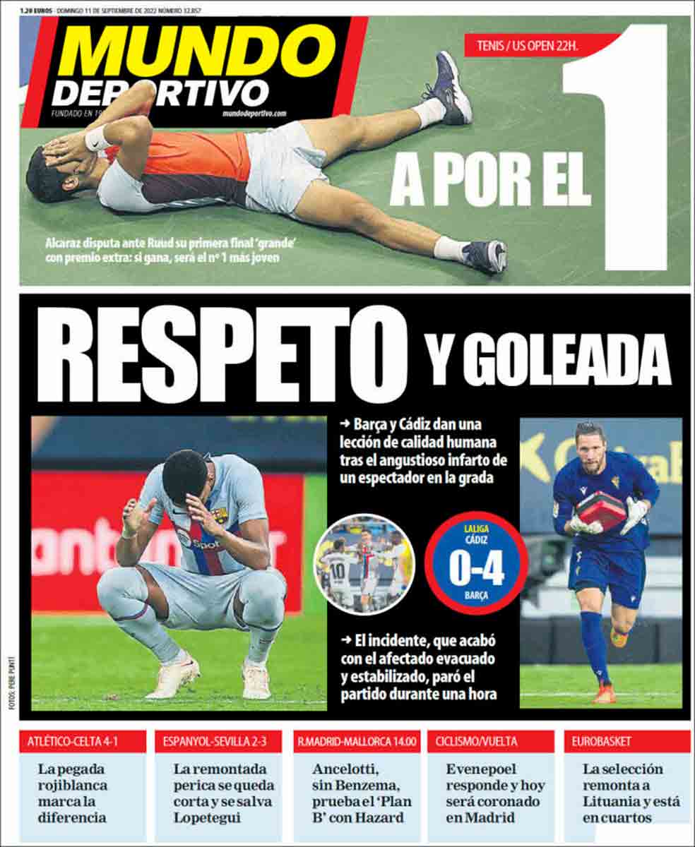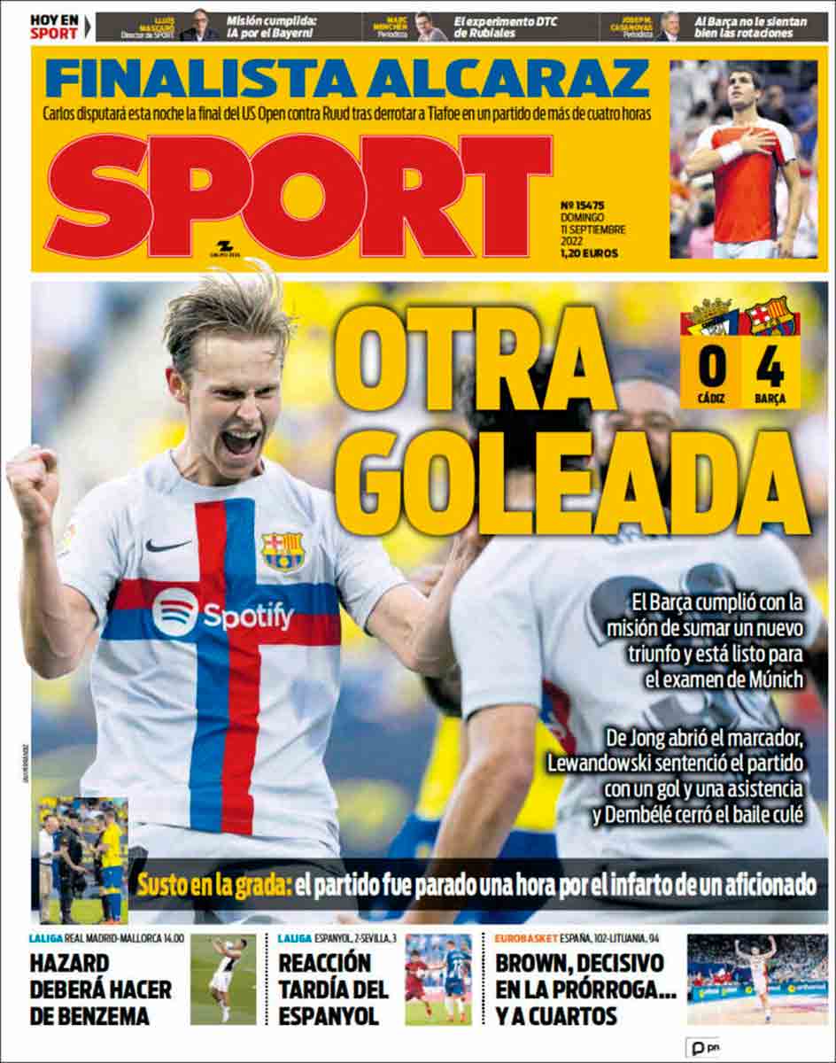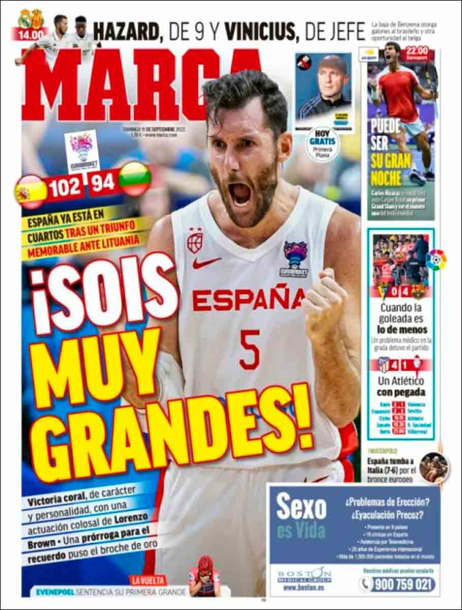 Y si de brillantez hablamos, es un orgullo no poder eludir los motivos centrales de las portadas madrileñas: por un lado, la gallardía de la selección de baloncesto y, por otro, el vértigo del joven Alcaraz. La primera conquistó anoche su enésima plaza -parece un ejército ese equipo- al ganar en la prórroga a Lituania, obteniendo su pase a los cuartos de final del Eurobasket. El segundo disputará esta noche la final de US Open, con el número 1 del mundo como premio aún más gordo.
