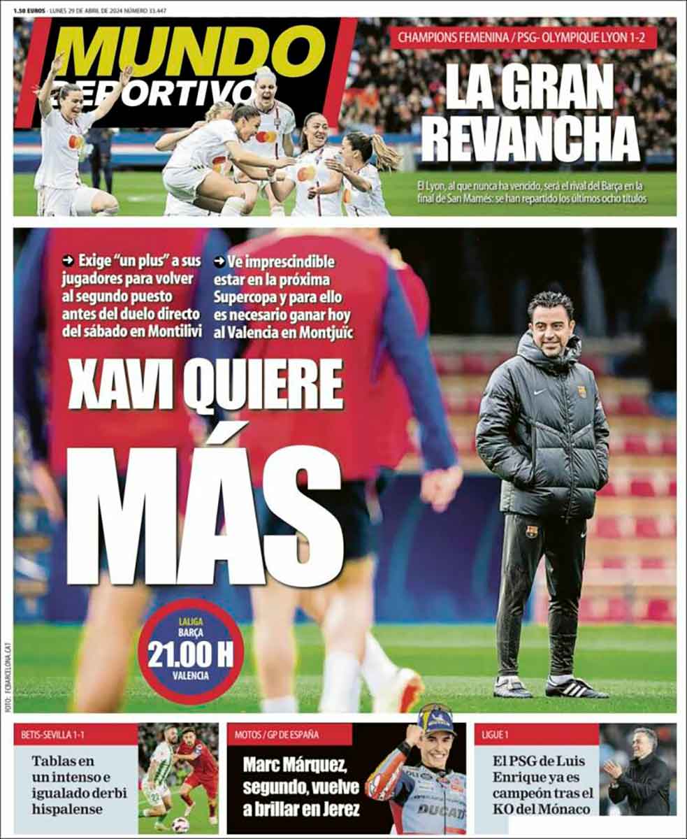 Mundo Deportivo coge ese absoluto desastre, te lo envuelve con papel de purpurina que acaba de comprar por Amazon y te presenta la posibilidad de que el Barça quede segundo como el paradigma del éxito y de la ambición. ¡"Xavi quiere más"!