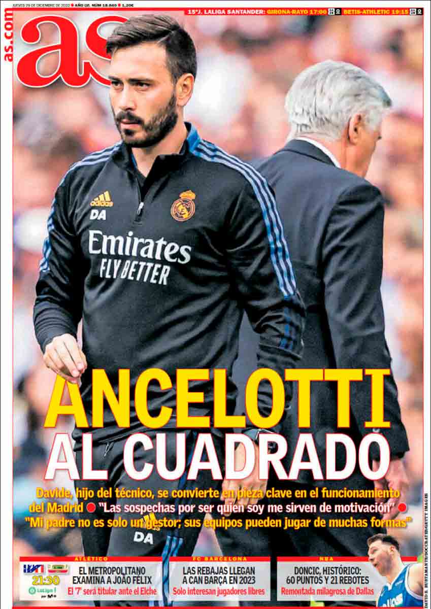 En esta víspera del regreso, As dedica su portada a Carlo y Davide Ancelotti, “Ancelotti al cuadrado”. Davide no es ajeno a los prejuicios existentes por ser hijo de su padre y así lo afirma, pero asegura que le sirven de motivación. Realmente los prejuicios no son por ser hijo de su padre, sino porque su padre es el entrenador del Madrid y él su ayudante. Sin embargo, a Xavi Hernández lo ayuda su hermano Óscar y no se habla de ello, tal vez porque no ganan nada. También se refiere Davide al sambenito de mero gestor que cuelga sobre Carlo. La verdad es que frente a ambas acusaciones lo mejor es responder con hechos: la pareja de Ancelottis funciona al frente del Madrid, la Catorce, la Liga, Supercopas, etc; y el “gestor” Ancelotti es el entrenador con más victorias en Champions y también el que la ha conseguido más veces, además de otros récords en competiciones nacionales. Que sigan acusando.