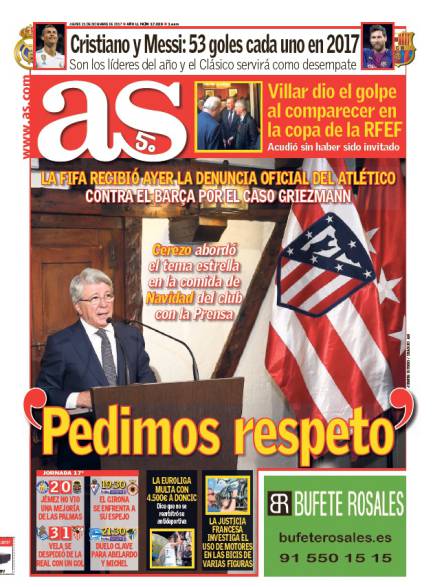 Glorioso, el editorial de Relaño. Hasta casi parece un poquitín auto-irónico: "[...] concentración de invitaciones a la prensa para un gañote feliz de Navidad. Atlético [...], Real Madrid y Federación coincidieron en ciudad [...] y en día y hora [...] en su agasajo a la prensa. Día de comidas y comidillas. [...] Hubo quien repitió, hasta quien 'tripitió'. As tiene tropas y espíritu de servicio suficientes como para acudir a los tres frentes, sin menoscabo de su energía para mantener el ritmo de producción. El mayor foco, claro, estuvo en el Atlético, no sólo por derecho de primacía, pues fue el primer convocante (eso sin considerar la excelencia del convite, sin parangón)".