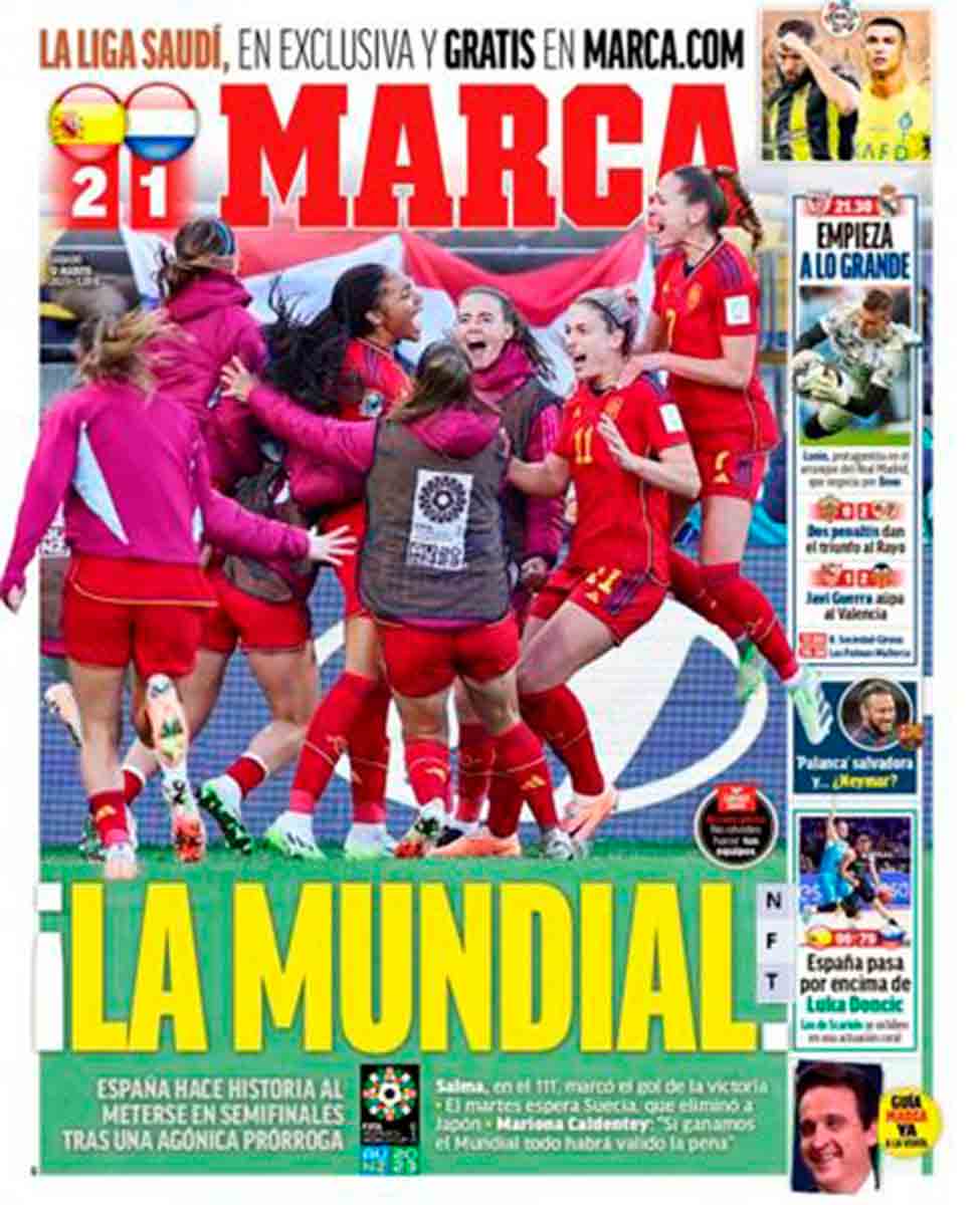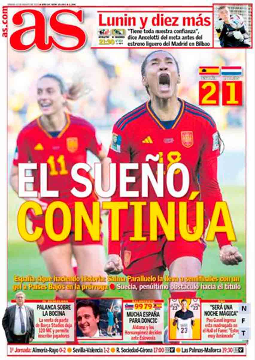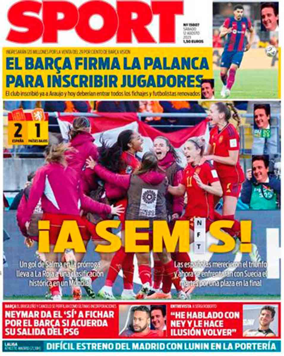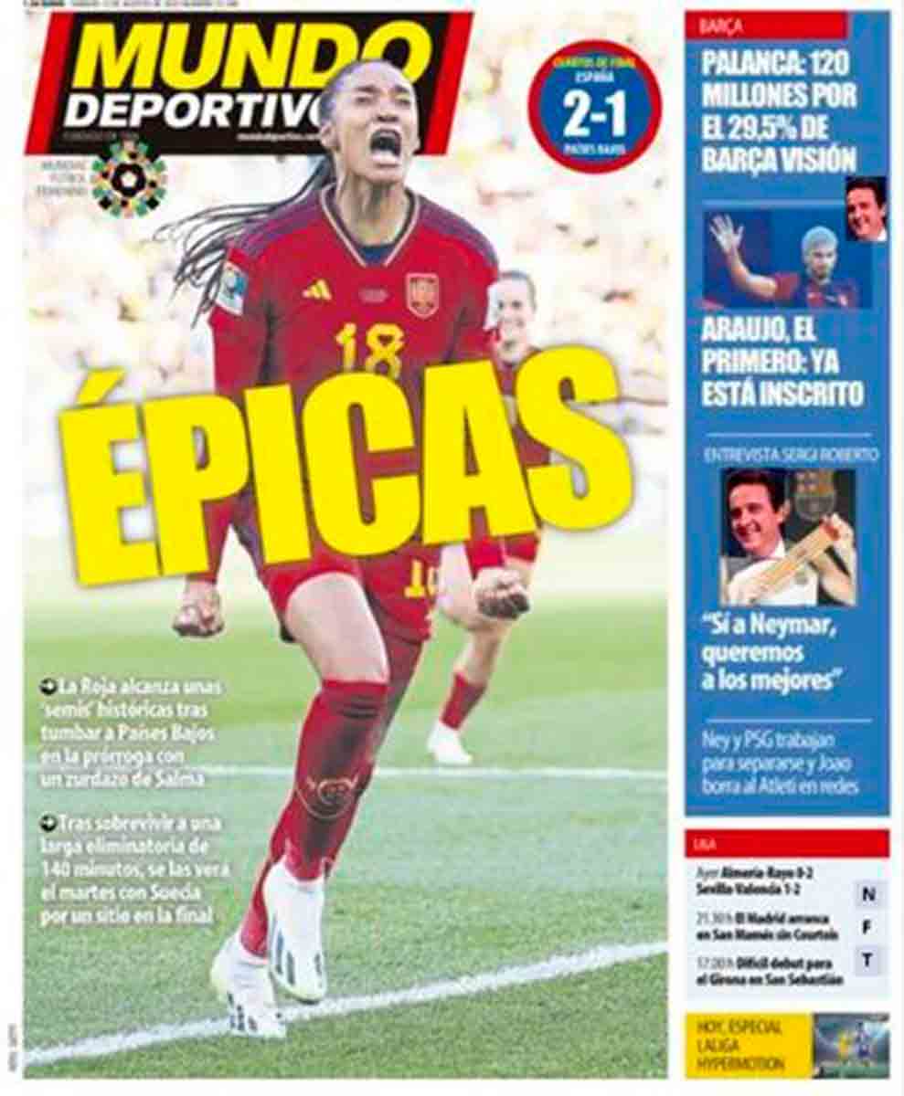 Las portadas de hoy sábado vienen dedicadas a la hazaña ocurrida la madrugada del jueves al viernes en España. Son las cosas de las antípodas y los husos horarios, mas no por ello debemos hacer de menos al éxito histórico de nuestra selección femenina de fútbol. El equipo dirigido por Jorge Vilda se clasificó de manera brillante para las semifinales del Mundial de fútbol femenino que se celebra en Australia y Nueva Zelanda. Enhorabuena a todas ellas, al seleccionador y a los artífices del éxito de un equipo que ahora mira hacia arriba, con hambre y sin complejos.