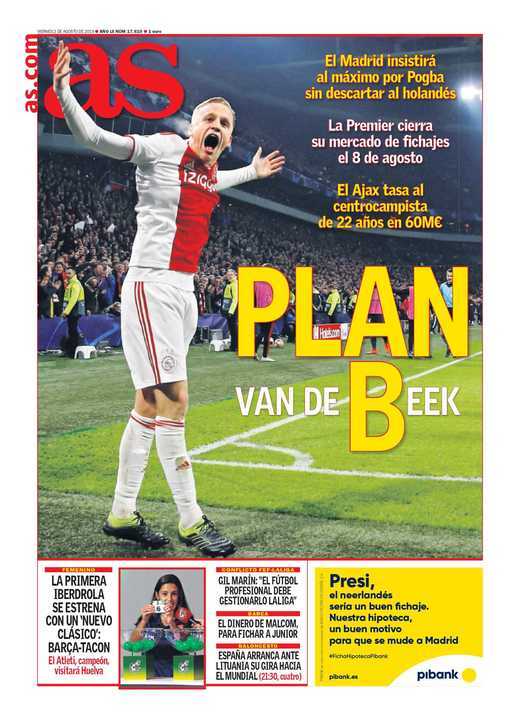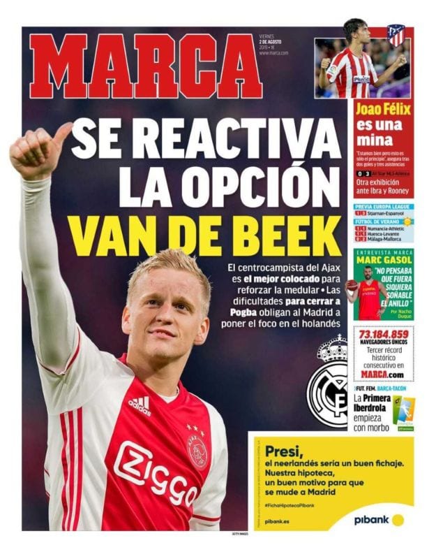 Buenos días. Donny Van de Beek cobra fuerza en lo mentideros de la capital como posible e inminente fichaje del Real Madrid. El pulmón del Ajax, bajo cuyo empuje accedió a semifinales de la Champions el cuadro holandés la temporada pasada, tras eliminar brillantemente al propio Real Madrid, se antoja una alternativa de primer nivel a Pogba.