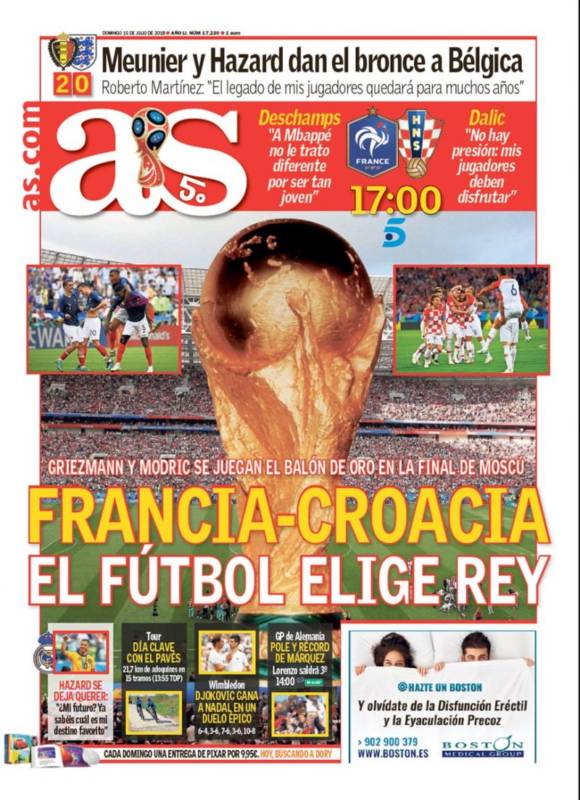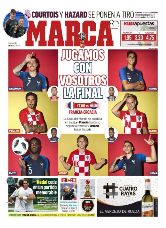 El único 'pero' que encontramos es en la portada de 'Marca', ya que la prensa española sigue empeñada en adjudicar éxitos ajenos a nuestro fútbol. Para ellos, gane quien gane, la Liga es la verdadera vencedora. "La banca siempre gana", que diría aquel. Pero no, amigos de 'Marca'. Si gana Francia, la gloria será para Francia. Si gana Croacia, la gloria será para Croacia. La Liga tiene cero méritos en el partido de hoy. Que pasen ustedes un fabuloso domingo.