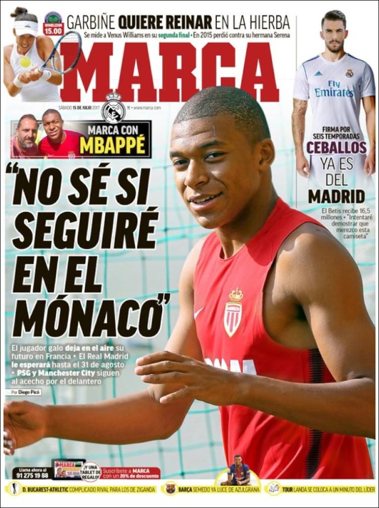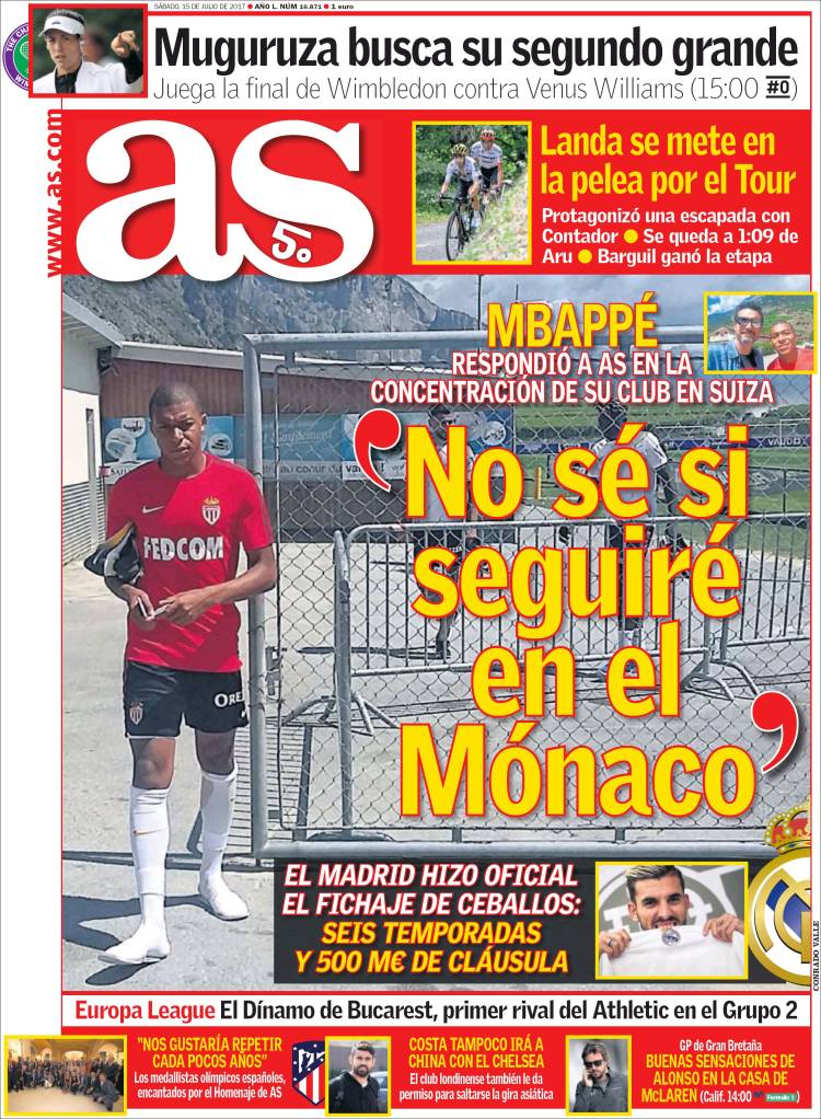 Se ve entonces que el caso de Marca y As no es igual que el de Sportivo. Aquí no hay fusión ni nada que se le parezca. Aquí han coincidido hoy en lo mismo (ya lo han hecho en el pasado y volverán seguro a coincidir en el futuro) porque el verano es el verano, porque la cosa de los fichajes es casi lo único que echarse a la boca y porque había que aprovechar que Mbappé pasaba no por Valladolid, sino por Suiza para seguir dejándose querer por el Madrid. Así que al contrario que en el caso anterior, esta coincidencia, esta cercanía no revela una identificación plena, sino una lucha, una competencia, una rivalidad por querer destacar más que el otro elemento de la pareja y así, suponemos, intentar mejorar la cuenta de resultados, y no sabemos si tanto la calidad de información.