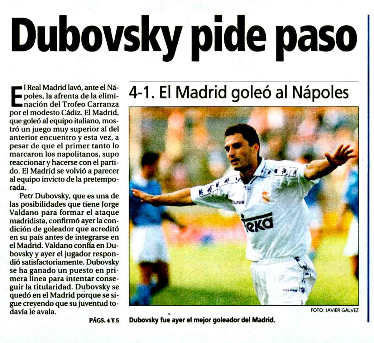 Mientras que el diario MARCA lo calificó como lo mejor del partido: “El gol de Dubovský, primero del Real Madrid, toda una demostración de clase, categoría y elegancia”. Antes del descanso Amavisca culminó la remontada y en el 5’ de la segunda mitad volvió a marcar Dubovský. El eslovaco combinó con Amavisca que “mandó un centro con tiralíneas y Dubovský lo selló de un excelente y certero cabezazo que mandó el balón a la red sin que el guardameta pudiera hacer nada por impedirlo”, según reseñó F. Sotillo Oñoro. Alfonso en el 79’ cerraría el tanteo definitivo del duelo con un 4-1 para los blancos. El entrenador Jorge Valdano quedó muy contento con la actuación general del equipo y explicó que jugadores como Dubovský “se han ganado el sobresaliente”, añadiendo que junto a Sandro y Amavisca “ha sido muy positivo su trabajo. Han mostrado gran atrevimiento y determinación en los últimos metros. Esto les hace acreedores a una camiseta que no es fácil ponerse. Ellos están demostrando que se la pueden poner”.