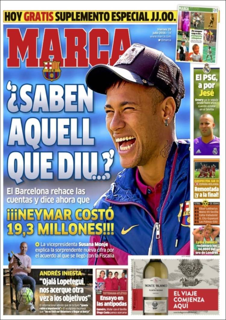 "¿Saben aquell que diu...?", publica Marca en portada junto a la efigie de Neymar a mandíbula batiente, y a nosotros, discretos a la par que puntillosos observadores de los quioscos, no nos queda otra que partirnos la caja y desencadenar el cachondeo. Gracias por las risas. Se agradecen en la mañana de otro árido viernes laboral en la ardiente meseta, donde el sol no sale por las mañanas, sino que llega directo de reenganche desde un afterhour maloliente. En el caso de que no hayan captado el chiste de la portada de Marca y aún permanezcan obtusos, sea por el viernes o sea por el recaliento neuronal estival, cabe destacar que ayer una señora que lleva los dineros del Barça salió a la palestra para revolucionar conceptos financieros y anunciar que el fichaje de Neymar Junior (y de su padre) costó a las arcas del Barcelona 19,3 millones de euros.