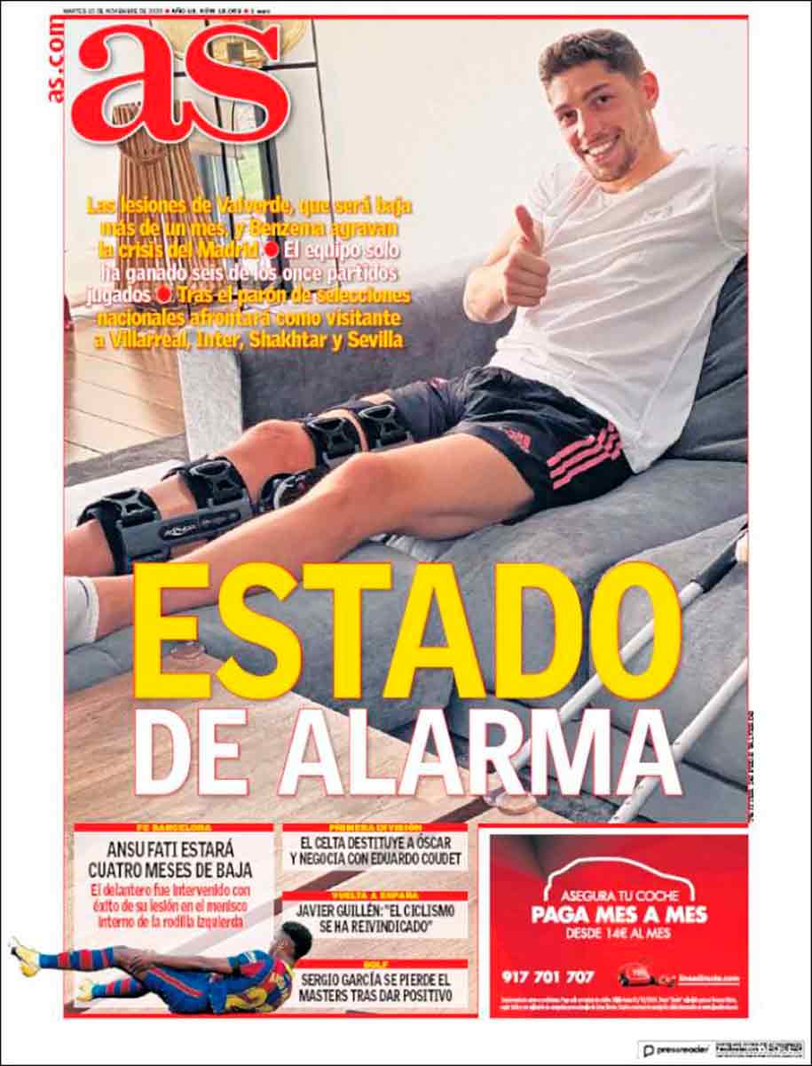 As abre con la fotografía de un sonriente Valverde ataviado con un extraño artefacto biónico en la pierna y titulan “Estado de alarma”. La Ouija Today en todo su esplendor, aprovechando hasta la última gota de la coyuntura actual para presumir de ingenio. Después, como no podía ser de otra manera, desglosa todos los problemas del Real Madrid por si no los tenemos claros: derrotas, lesión del propio Fede, calendario complicado... La verdad es que el contraste de lo leído con la sonrisa del Pajarito que lo ilustra es como darle un bocado a una guindilla con aspecto de jamón ibérico. No negamos que el Madrid (como todo hijo de vecino en estos tiempos que corren) tiene problemas importantes, pero hay manera y maneras, querido As.