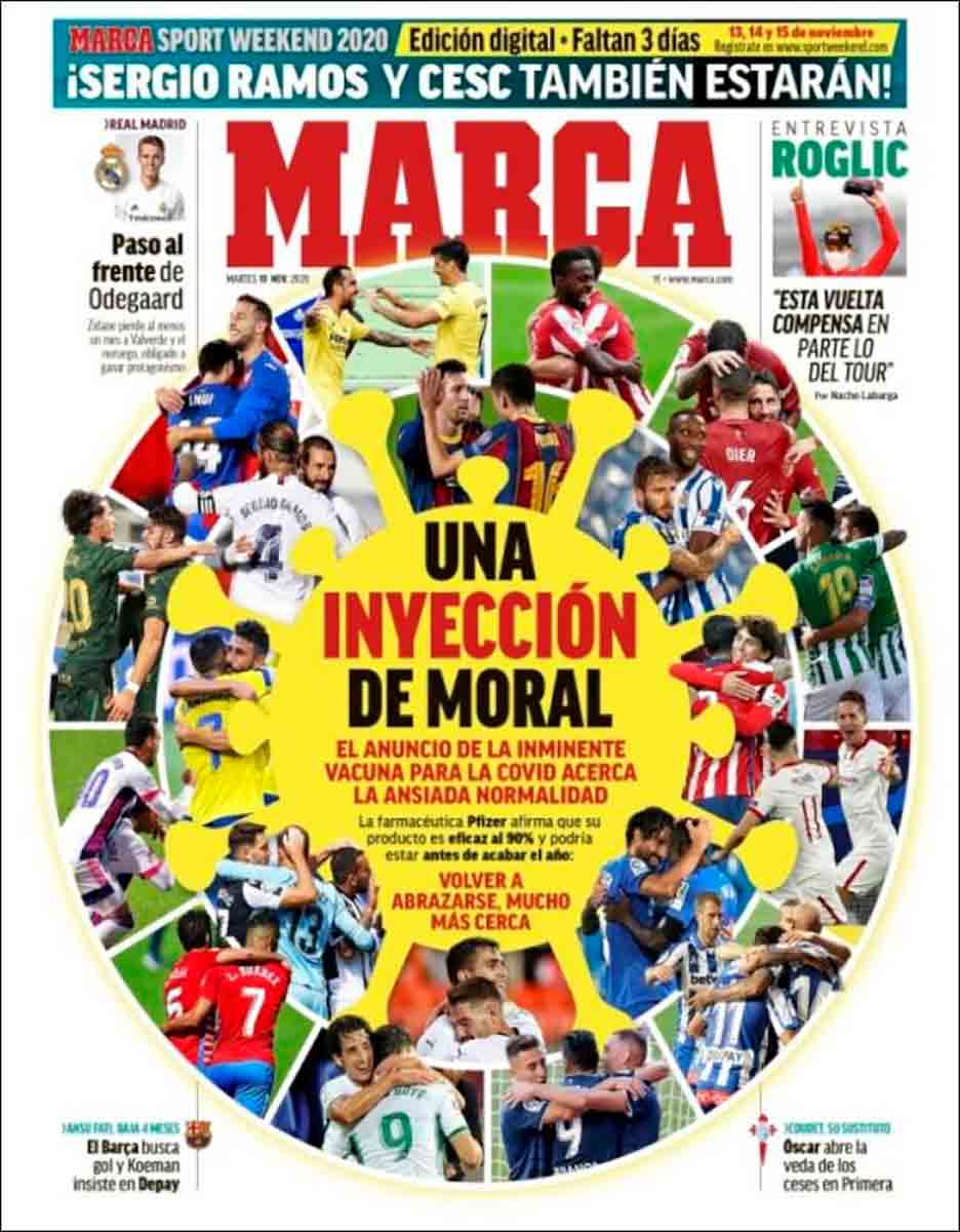 Nos despedimos con la portada de Marca, que trae una buena noticia esperada por todos, una noticia importante de verdad, una inyección de moral, como titula el diario: la farmacéutica Pfizer anuncia que ha desarrollado una vacuna contra el COVID-19 que tiene una efectividad del 90 %. Sabemos que hay que tomarlo con cautela y que, aunque no surja ningún problema, no será ni la panacea ni inmediata, pero abre una ventana de esperanza y muestra que hay salida. Una salida que necesita el fútbol, con muchos clubes disputando la prórroga con solo diez jugadores y ateridos de calambres.