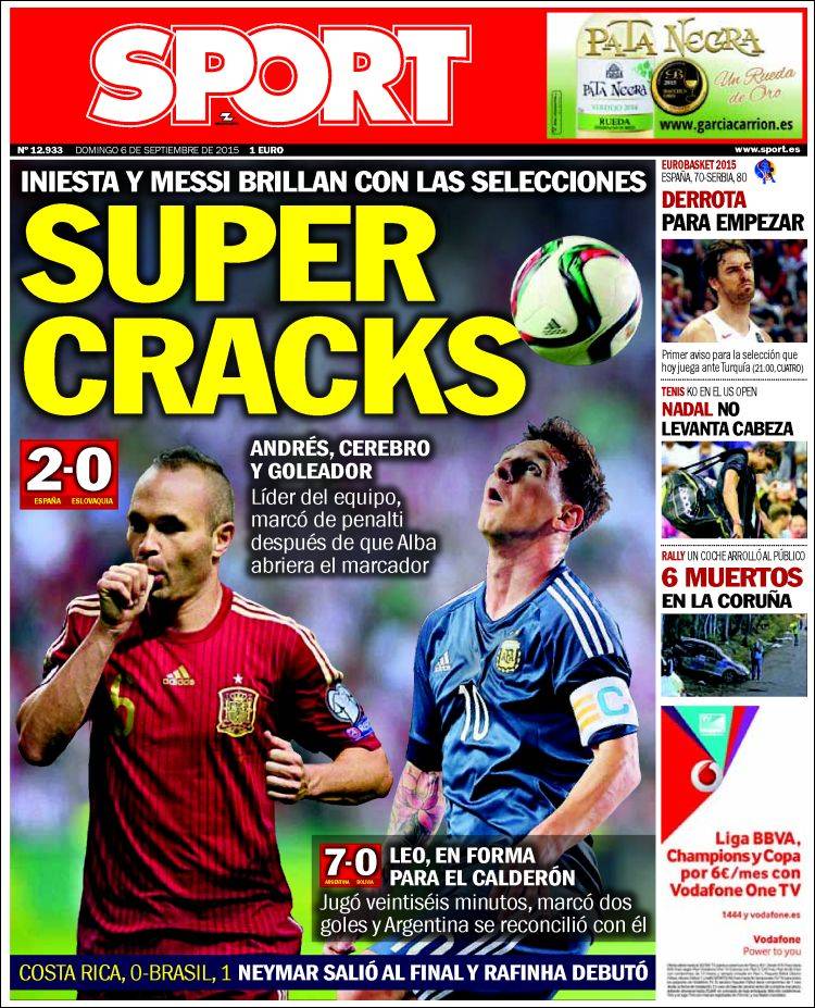 Como decimos, se difumina poco a poco la presencia del accidente en las portadas deportivas, a la vez que aumenta el uso culé de los partidos de selecciones. Tal vez ya el extremo de Sport constituya el exceso contrario del cometido por Marca. Una cosa es que la prensa deportiva no sea de sucesos y deba proseguir con su labor más o menos específica, y otra bien distinta es que apenas dé cuenta de una noticia especialmente dura ocurrida en un ámbito deportivo. Una vez más hablamos de balanzas y equilibrios, y nos parece que Sport peca por defecto, nos parece que se queda corto, que se muestra demasiado parco y que, en resumen, la noticia del accidente merece mayor consideración.
