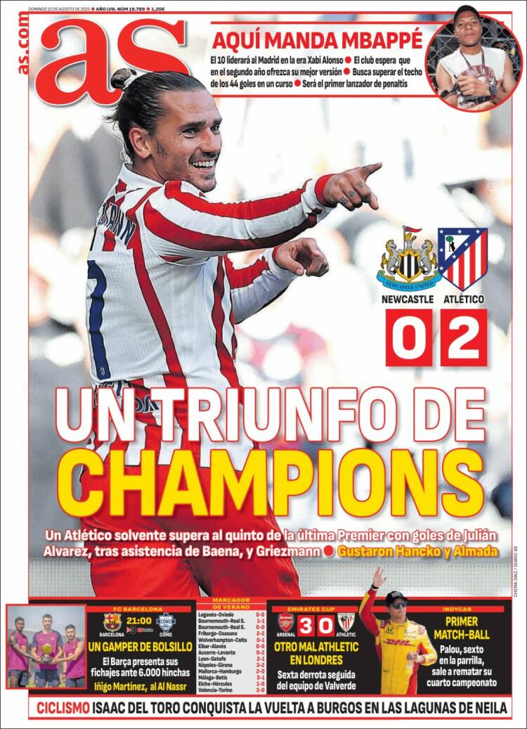 Marca se despacha con Julián Álvarez chocando las manos con Baena. Es, sin duda, una dupla ofensiva. El argentino es un grandísimo delantero. El otro, más bien un jugador que ofende. El titular “Muestra sus armas” está muy bien, pero lo consideramos extemporáneo, pues se nos ocurre que el momento de mostrar las armas es, quizá, hacia la primavera, no en agosto, pero qué sabremos nosotros. No lo podemos entender. Tampoco se especifica si el gol de Julián fue a uno o dos toques.