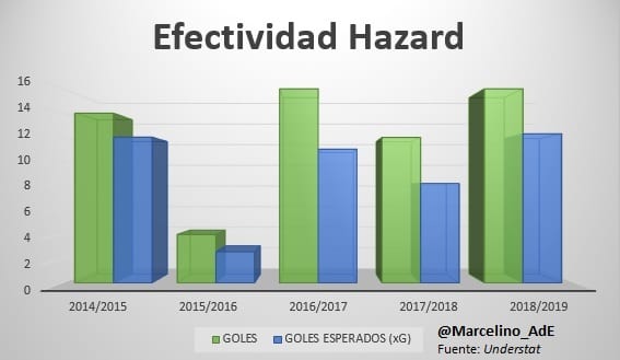 No termina de encontrar forma de llegar a los goles fáciles. Si uno repasa los goles de Hazard, pocas son las situaciones francas de remate que encuentra. Dentro del área no se desenvuelve con soltura a la hora de encontrarlas. Asimismo, en sus movimientos sin balón tiende a dirigirse al balón y no a la portería. Sus desmarques son de apoyo, no de ruptura.