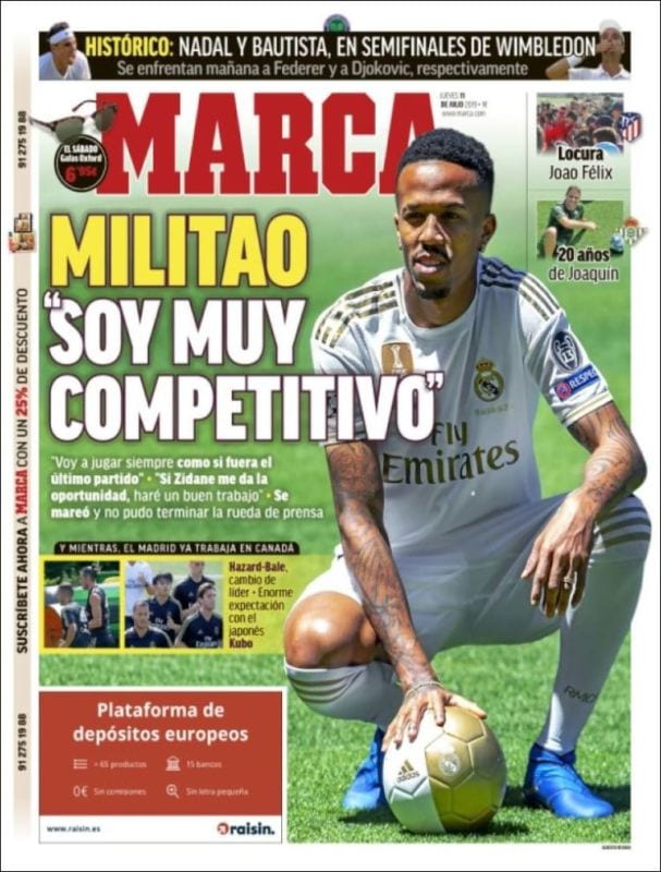 La indignación se acrecienta al constatar cómo las portadas del día, dando mayor o menor relevancia al hecho mismo de la presentación de Militão, prácticamente solo destacan de ella el pueril incidente. Ese es el nivel, amigos, y lo podéis comprobar en estas portadas dignas de patio de corrala. Marca es el más discreto, aunque tampoco se priva de comentar lo del mareo (que ni siquiera llegó a ser tal) como si tuviera relevancia digna de portada.