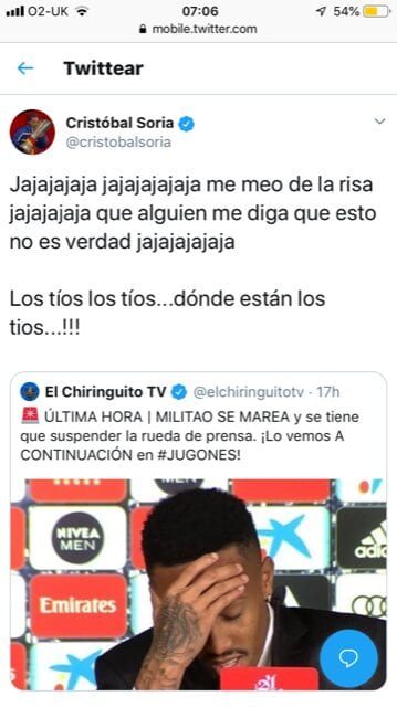Las redes sociales, en su vertiente madridista, no se tomaron a bien los trinos de tipos como Soria y Mateu. Nosotros tampoco nos lo tomamos a bien pero no porque debiera estar prohibido frivolizar sobre un incidente afortunadamente nimio, sino porque hay que tener un mínimo de clase para poder hacerlo como Dios manda, que es con un punto de sana malicia y otro de simpatía y elegancia, cosas de las que carecen estos insignificantes bultillos sospechosos. "No hay sentido del humor", se quejaba uno de ellos después, ante la avalancha de críticas recibidas. Claro que no lo hay. Sobre todo por tu parte, bufoncillo patético.