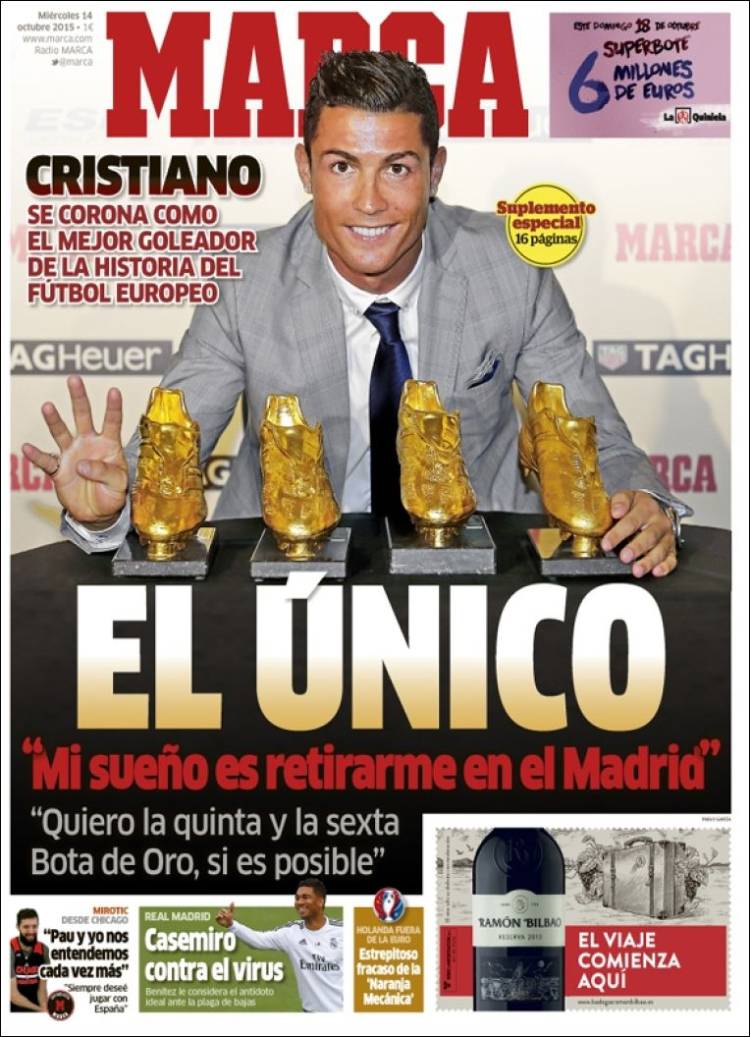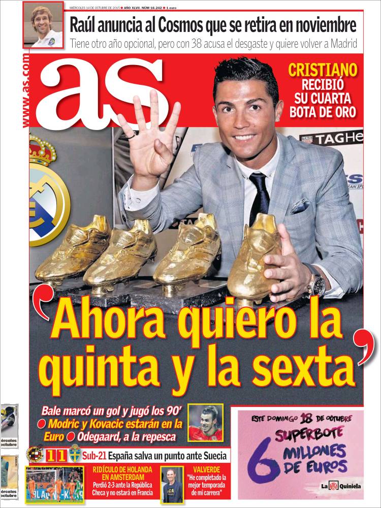 Mundo Deportivo tampoco le da mucha bola a Cristiano, pero al menos informa en pequeñito de la nueva hazaña de Cristiano con un titular completamente aséptico. "CR7 recibe la Bota de Oro por cuarta vez". No sabemos si, vista la comparativa, hay que aplaudirles. Curiosos tiempos estos en que la menor muestra de decencia merece un monumento.