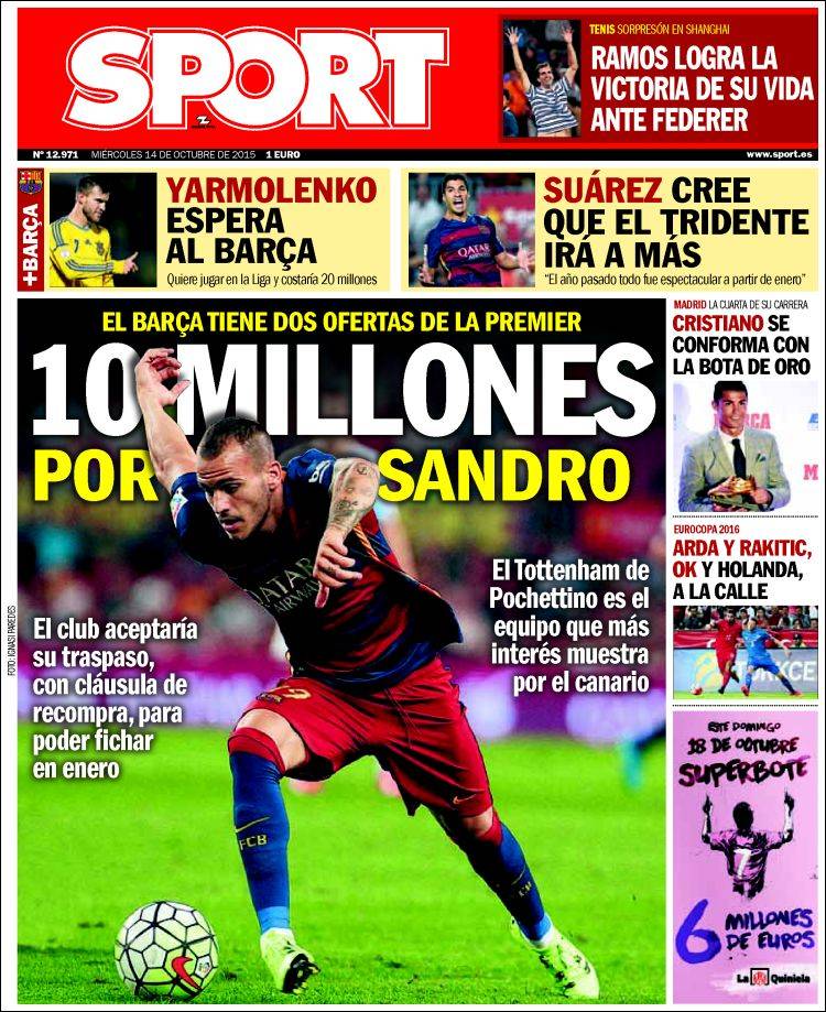 Sport apenas presta atención a las cuatro Botas de Oro de Cristiano, pero hay que comprenderles porque la actualidad manda: el Tottenham (de Pochettino) ofrece diez millones (¡diez millones!) por Sandro. Con todo el dolor de su corazón (no nos cabe duda), e impelidos por la obligatoriedad de otorgar su portada al rumor de Sandro (es solo un rumor, pero es que es ¡Sandro!), los chicos de Mascaró y compañía han tenido que relegar a Cristiano a un cuadradito a la izquierda, pero por lo menos lo han hecho desterrando en el intento cualquier tentación de sectarismo: "Cristiano SE CONFORMA con la Bota de Oro".