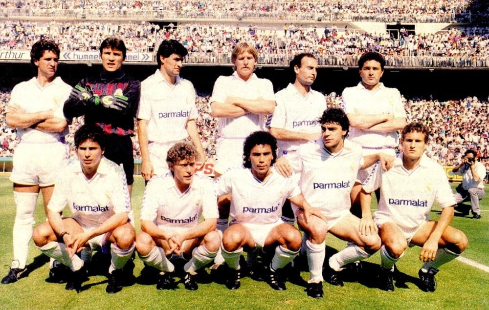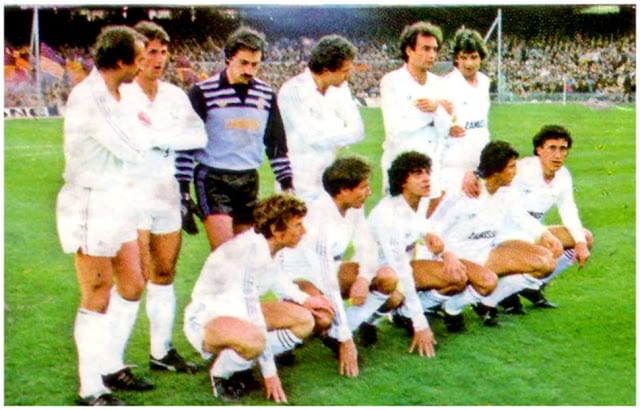 Jornada 36 del Campeonato Nacional de Liga, R. Madrid-Español, tarde de sol de justicia en Chamartín (os lo aseguro) y el Real Madrid se preparaba para certificar su vigésimo cuarto título de campeón. El partido, sin novedad, HUGO SÁNCHEZ cumplía 200 partidos oficiales con el Real Madrid y lo celebraba con un golito de los suyos. BUTRAGUEÑO y GORDILLO se unen a la fiesta marcando goles y metiendo la copa de campeón en las vitrinas blancas. El Campeonato, como los anteriores, un verdadero paseo de la Quinta de los Machos (la del Buitre más Hugo Sánchez, ya sabéis). Leo Beenhakker dirigía con acierto el grupo y éste se lo devolvió con un balance impresionante; 25 victorias, 12 empates y una sola derrota, marcando 91 goles y encajando nada más que 37, sacando 5 puntos al Barcelona en una liga de 2 puntos por victoria y 13 al Valencia, 3º clasificado. HUGO marca 27 goles, BUTRAGUEÑO 15 y MICHEL 13. Un espectáculo, desde luego. Yo recuerdo esas temporadas ir al Bernabéu a ver cuántos goles iba a marcar el Real Madrid, porque marcar, seguro que marcaban, ¿cuántos? no se sabía, pero varios... Esta era la plantilla campeona: BUYO, AGUSTÍN CAÑIZARES, SANCHÍS, TENDILLO, CHENDO, SOLANA, JULIO LLORENTE, CAMACHO, MACEDA, MICHEL, MARTÍN VÁZQUEZ, GORDILLO, SCHUSTER, ESTEBAN, GALLEGO, MAQUEDA, HUGO SÁNCHEZ, BUTRAGUEÑO, PACO LLORENTE, ALDANA, LOSADA Y AGUILÁ.