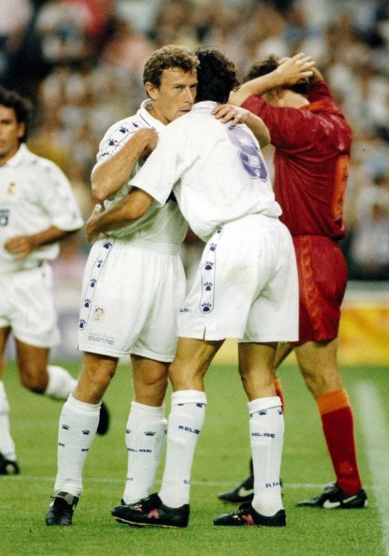 El ahora Director de Relaciones Institucionales del Real Madrid, Emilio BUTRAGUEÑO Santos fue, quizás, uno de los jugadores con más talento, chispa y genialidad que han pasado por Chamartín, para los que no tuvisteis el PLACER de verle jugar, voy a deciros algo... fijaos.... cuando EL BUITRE agarraba la pelota en el pico del área, se paraba y bajaba los brazos..... un murmullo se oía en las gradas... algo gordo iba a pasar, normalmente, gol o penalti. Nunca era una jugada baladí, nunca una acción inane, nunca un lance sin salsa, todo lo contrario, era un brote de genialidad en formad de chispa, en forma de arranque espectacular en 3 metros que dejaba seco al defensor, que le obligaba a hacerle falta o a despedirle con un pañuelo y no perderse el gol ulterior. Pues bien, este JUGADORAZO que dio nombre a una de las generaciones más exitosas del madridismo, se despedía en su partido homenaje de su afición hace ahora 24 años contra la Roma, a la que se le vapuleó por 4-0, en un Bernabéu a reventar, con goles de LUIS ENRIQUE, HUGO SÁNCHEZ, ALKORTA Y, cómo no... BUTRAGUEÑO. El mejor broche de oro a una carrera repleta de éxitos en la que jugó 463 partidos oficiales (17º en la clasificación histórica) y marcando 172 goles (9º en la historia del Club) Además, BUTRAGUEÑO ganó 6 ligas, 2 Copas de España, 3 Supercopas de España, 1 Copa de la Liga, 2 Copas de la UEFA, 1 Copa Iberoamericana, 1 Trofeo Pichichi y 2 Trofeos BRAVO al mejor jugador europeo menor de 23 años. Toda una LEYENDA blanca.