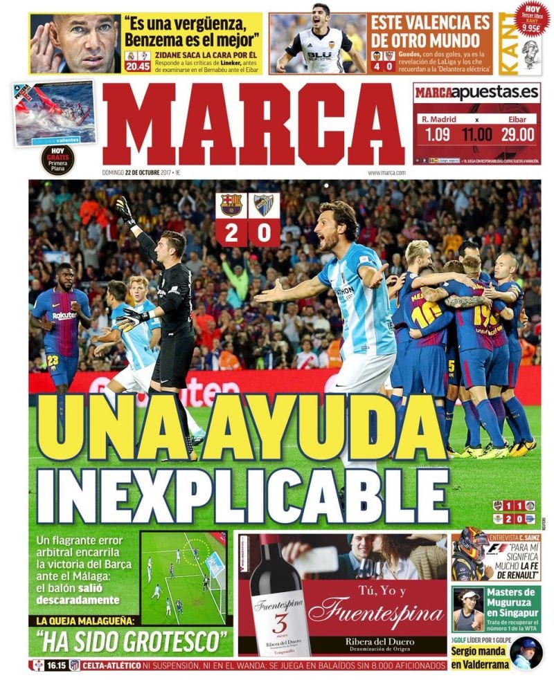 Anoche, en el partido contra el Málaga, un nuevo empujón arbitral permitió a los de Ernesto Valverde jugar con viento a favor. El 1-0 es tan ilegal que no hacen falta repeticiones para reafirmarlo. El balón sale un metro por línea de fondo antes de que pueda ser centrado. Todo lo demás es un espejismo que el colegiado se empeñó en convertir en realidad. Es una tras otra. Es cada semana. Es ante cualquier rival. Les da igual Liga, que Copa del Rey, que Supercopa de España.