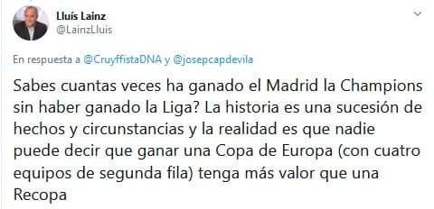 Este es el trasfondo de la polémica intervención en Twitter de Lluís Lainz, de quien no pretendo discutir su saber futbolístico y al que reconozco su labor de analista en Radio Marca y Gol Televisión hace unos años. Sin embargo, su exposición, ayer por la tarde, podría haber sido firmada por el mismísimo Toni Freixa. Me gustaría que este texto pueda servir de réplica a una de sus afirmaciones ante la cual mi desacuerdo es absoluto:
