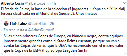 Antiguamente ganar la copa de europa era algo mucho más complicado que ahora. El hecho de q solo participaran campeones de liga te obligaba a hacer dos años casi perfectos. Además las eliminatorias eran a partido doble y podías quedar eliminado a la primera. La UEFA tenía un nivel brutal porque participaba la clase alta Europea. Ahí estaban 2 3 y 4 de las principales ligas. La recopa era un torneo menor en el que el Madrid apenas participó. De la copa de ferias no hablo porque era un competición en la que sólo jugaban ciudades con ferias y por ejemplo Madrid ni siquiera estaba. De hecho la UEFA no las ha homologado. Reconozco q ahora mismo la Champions es muy espectacular y muy competitiva pero antes era más difícil ganar la copa de europa. No le quito mérito a nuestro equipo sino que se lo doy a la quinta del buitre.