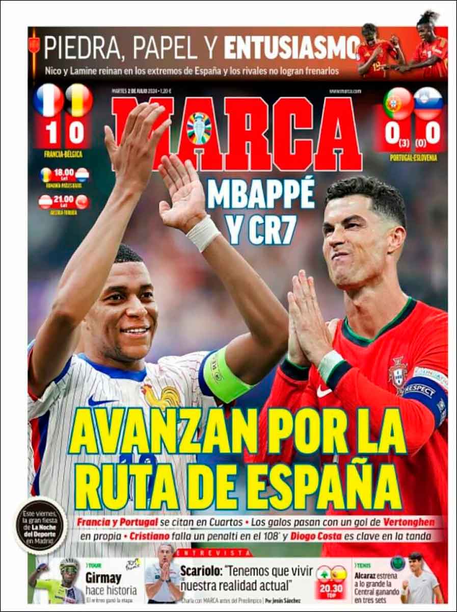 Marca, además de a Cristiano, incluye a Mbappé en su portada. Ambos «Avanzan por la ruta de España», como titulan. Franceses y portugueses se clasificaron, como sabéis, y se enfrentarán el viernes a las 21 horas, después del España-Alemania. Tarde-noche entretenida.