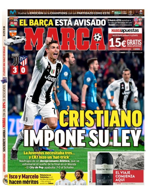 No le ha quedado otra a la Central Lechera que llevar la figura de Cristiano Ronaldo a las primeras páginas. Bien jugado, por cierto, ya que el recital del portugués les evita tener que ser muy duros con el eterno merecedor de Copas de Europa. Ni un palo al Atlético de Madrid en las portadas. Ni uno. Sólo 'La Ouija Today', en pequeñito, sin afán de hacer demasiado ruido, recuerda que los de Simeone no tiraron a puerta en toda la noche. Normal que el Cholo no se agarrase sus partes al finalizar el partido.