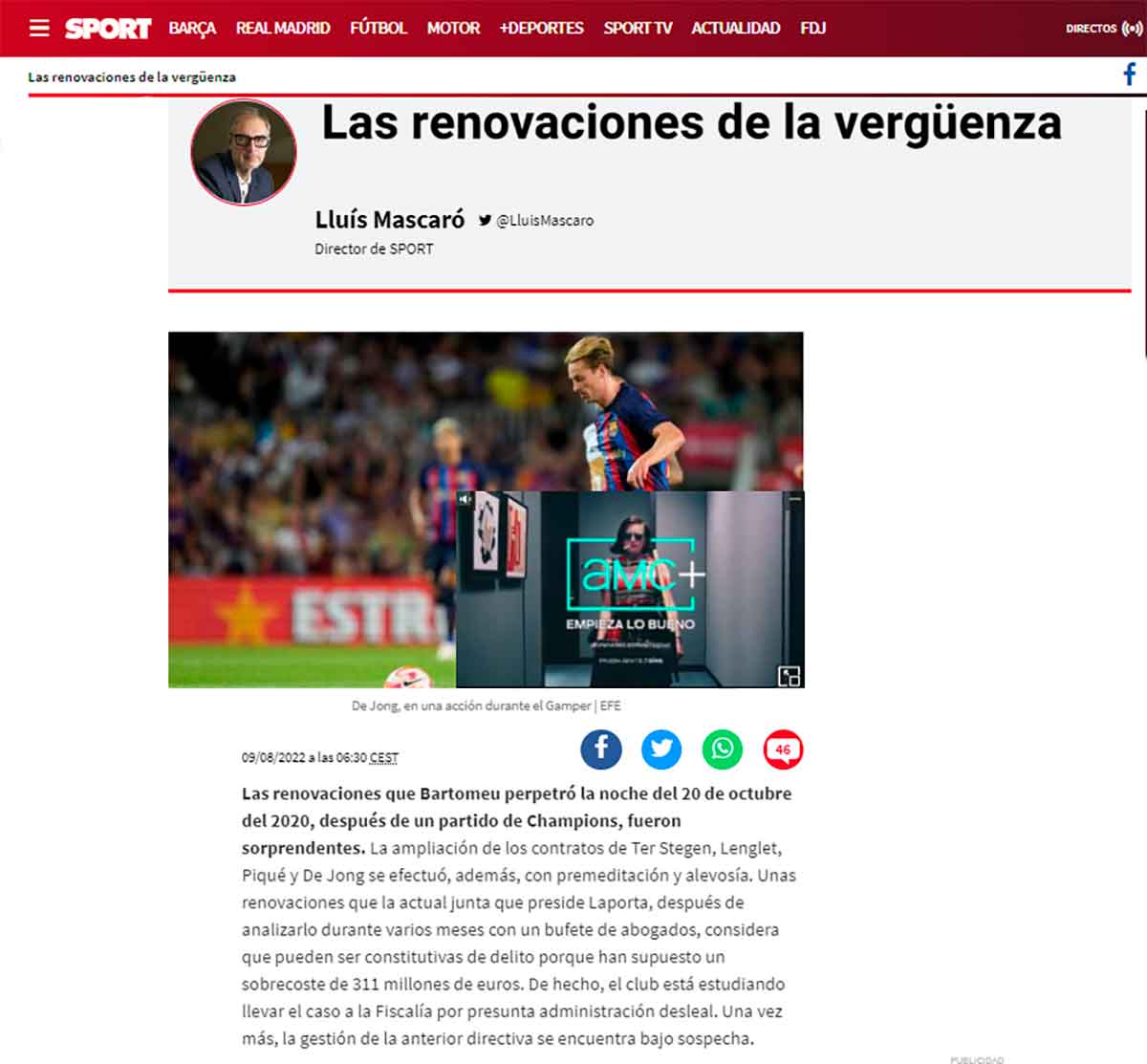 Y hoy aplauden con las orejas el comportamiento de Laporta y de repente aquellas renovaciones se han convertido en “renovaciones de la vergüenza”, en ampliaciones de contratos efectuadas “con premeditación y alevosía”.