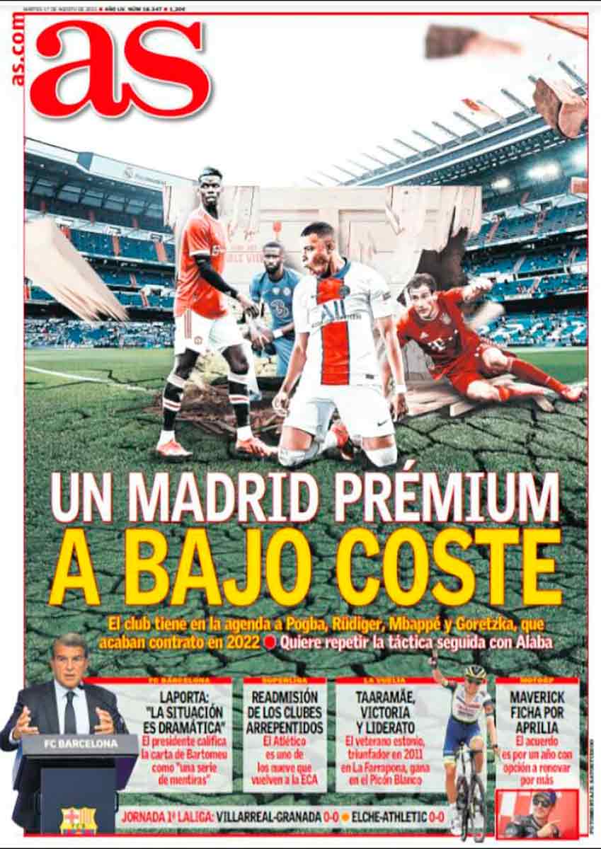 As se decanta por llevar en su portada lo que ellos denominan un Madrid prémium a bajo coste. Que no es más que colocar en el club blanco a varios grandes futbolistas que acaban contrato el año que viene. Ya os adelantamos que algunos vendrán y otros no, porque el As, a pesar de su relación la ouija, no es capaz de adivinar el futuro.