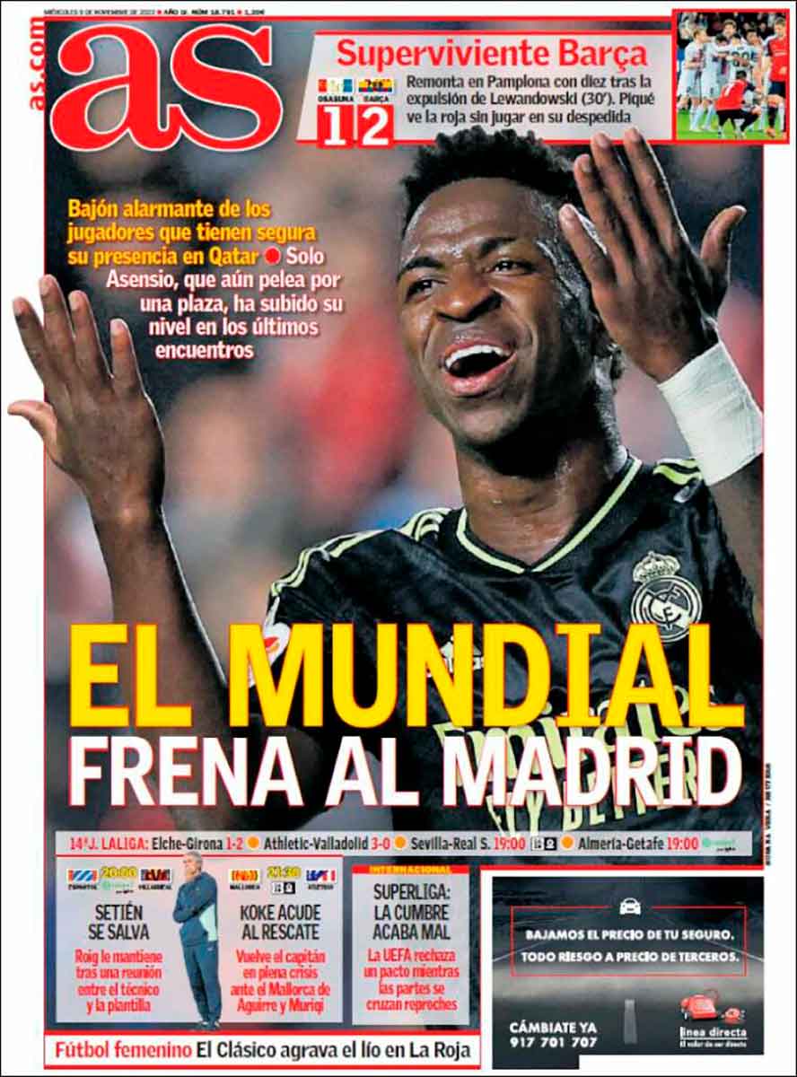 As es el único medio del día que se fija en el Madrid y que se hace, de manera indirecta, la pregunta que debe concernir al madridista, que es por qué hemos perdido (temporalmente, cero dramas) el liderato. La respuesta la da la propia portada (el mundial ha descentrado a los jugadores, muy cierto), aunque olvida el asqueroso cóctel institucional-mediático-arbitral-sociológico que ha logrado que Tebas alcance el liderato a la paz que conquista el relato (rima y todo).