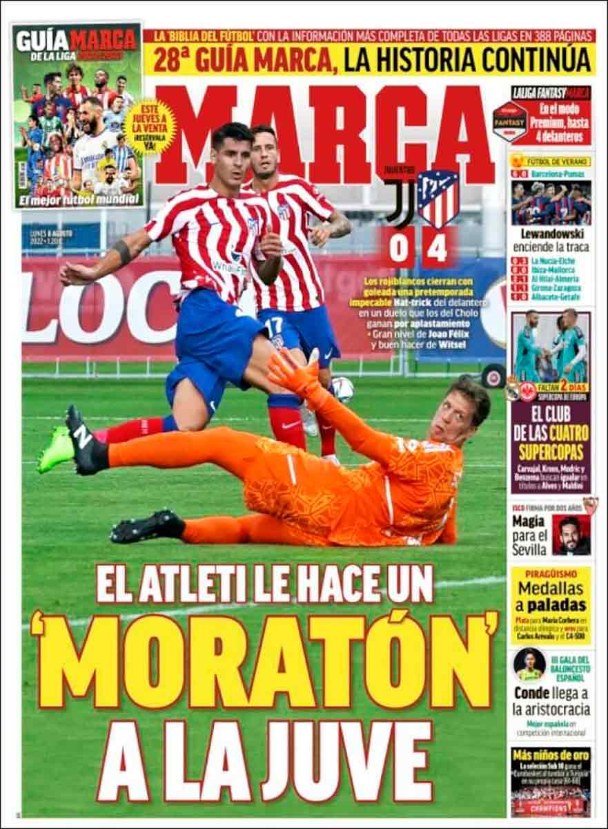 Marca, por su parte, loa a Morata a través de un juego de palabras que hombre, la verdad… El que estuvo bien ayer fue Iñako Díaz-Guerra comentando lo astuto de la estrategia seguida por la cúpula atlética: amenazan con fichar a Cristiano para que las masas rojiblancas cojan algo de cariño a Morata.