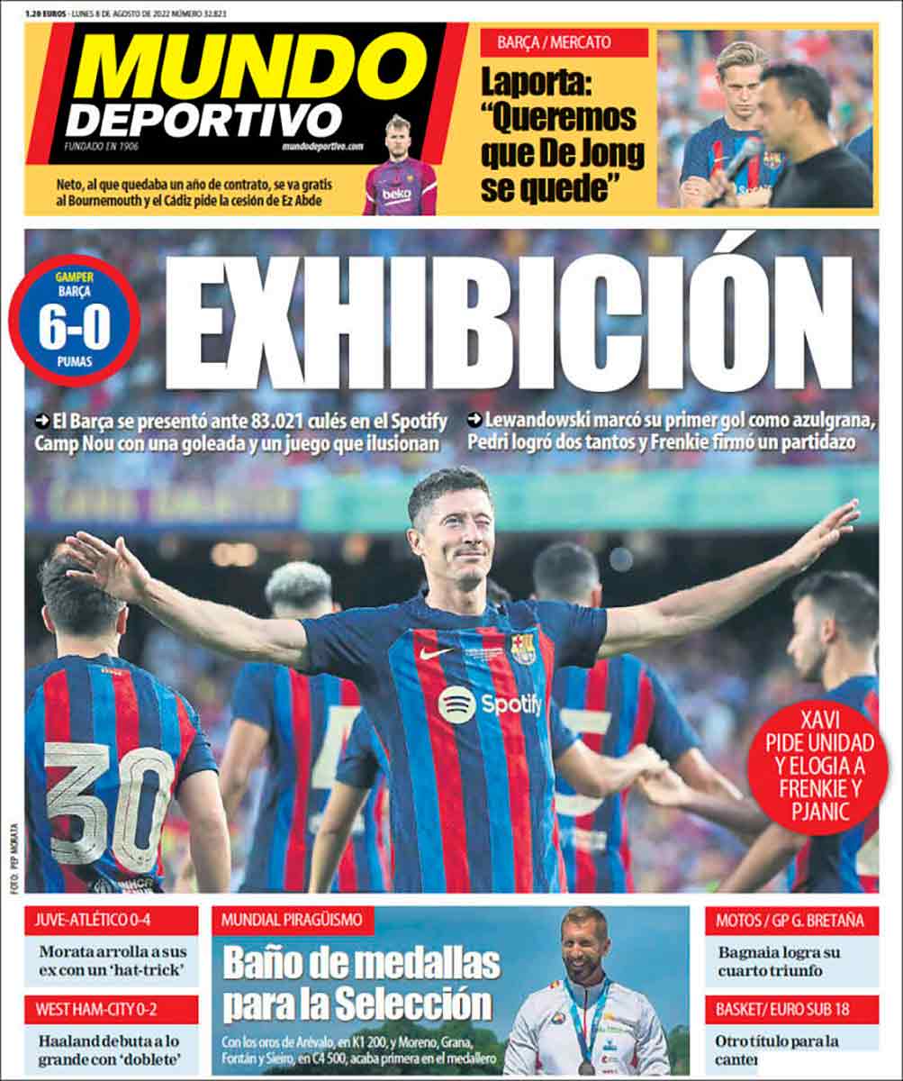 Mundo Deportivo habla de “exhibición”, y resalta el “partidazo” de “Frenkie”. Le llaman por el nombre y no por el apellido, De Jong, en la esperanza de que esa familiaridad mueva al neerlandés a perdonar la pasta que le deben, y la estrategia va más allá: Laporta afirma ahora, como vemos en el frontispicio, que “Queremos que De Jong se quede”. Mejor llamarle Frenkie, Jan, no estropees la estrategia del cariño iniciada por Mundo Deportivo. Es más: ¿por qué no FRENKI? Esa -e del final no sirve más que para obstaculizar la Operación Amor, aquella que ha de hacer prevalecer el afecto sobre el vil metal.