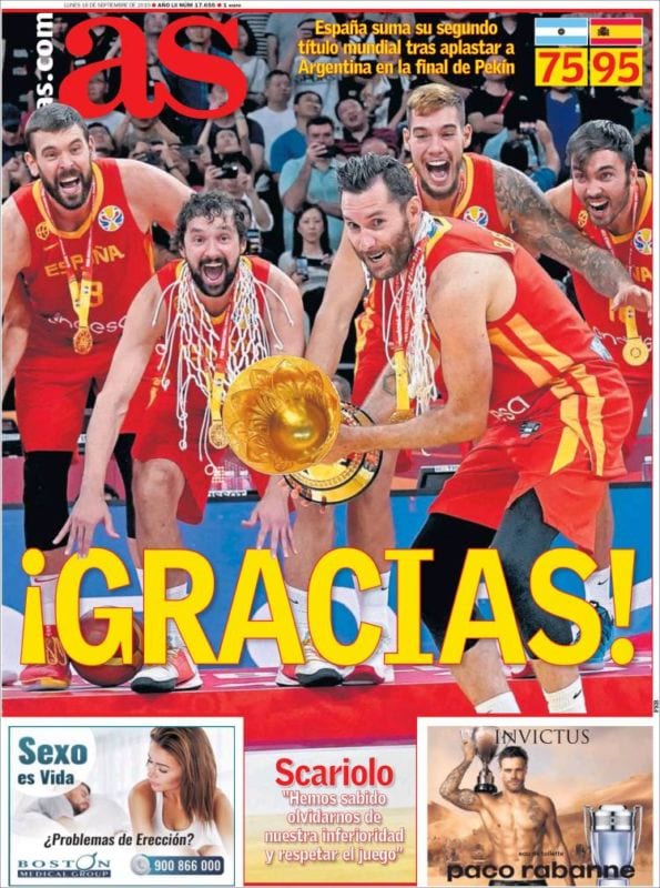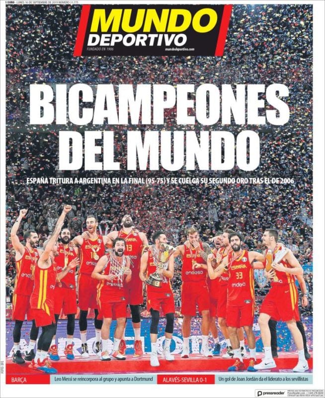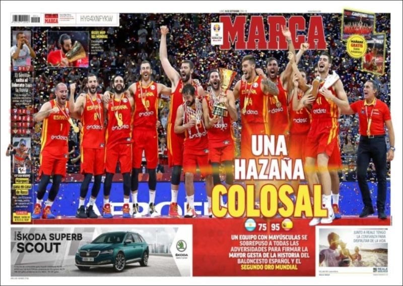 Buenos días. Mañana de gloria en la prensa deportiva patria ante el Campeonato del Mundo de baloncesto logrado por la selección española. Aunque ya ha sido dicho que La Galerna es apátrida, no es menos cierto que la mayoría de quienes en ella escribimos somos españoles y tenemos nuestro corazoncito nacional. Por lo demás, y desde la óptica exclusivamente madridista, ya antes de la Final celebrábamos el que nada menos que cinco jugadores de la entidad formaran parte de ella, repartidos entre el combinado español y el argentino. Así nos lo contaba Joe Llorente en este magnifico artículo.