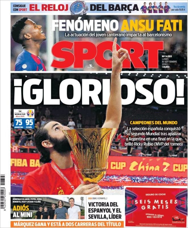 Cutrecillo, en cambio, como no podía esperarse otra cosa de la línea política de sus más destacados periodistas, el generalmente infame (hoy también) diario Sport, que tiene que personalizar en Ricky Rubio la cuestión para que no le acusen de español, y tiene asimismo el mal gusto de usar el dedo triunfante del de Masnou, que apunta al Cielo en dirección a su madre fallecida, para apuntar asimismo a la actualidad culé, que los de Folch no son capaces de descabalgar de su portada ni siquiera en una eventualidad festiva de este calibre. Nos hemos conmovido con ese gesto de Rubio hacia su madre, al contrario al parecer que Sport, quienes lo usan en beneficio de sus propios intereses hooliganescos.