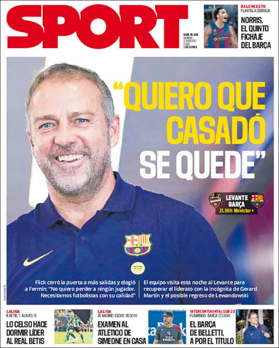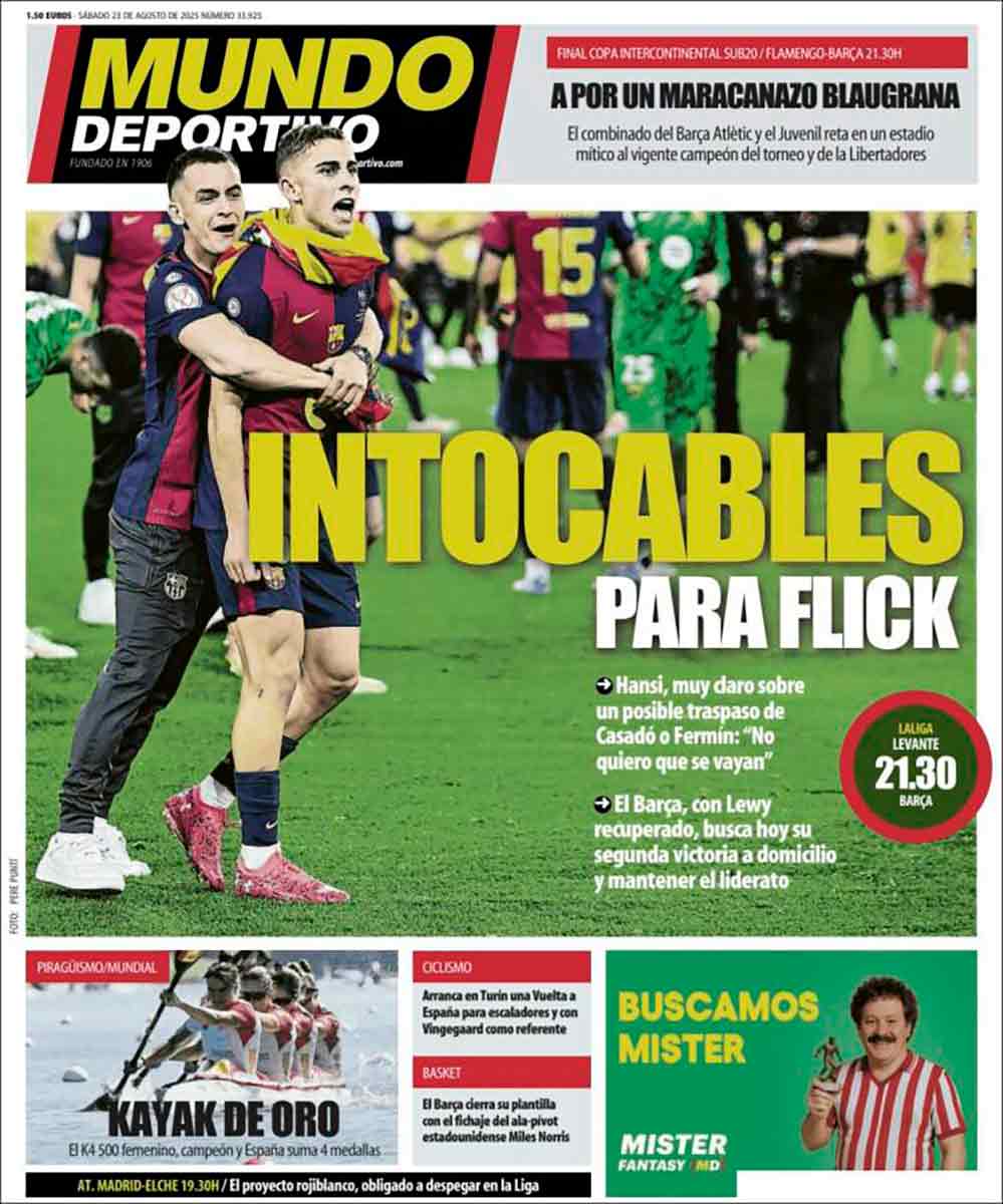 «Intocables» también es la palabra más destacada de la portada de Mundo Deportivo. El diario de Godó, grande de España, se refiere a Casadó y Fermín, sagrados para Flick. «Quiero que Casadó se quede», son las palabras del técnico azulgrana destacadas por Sport.