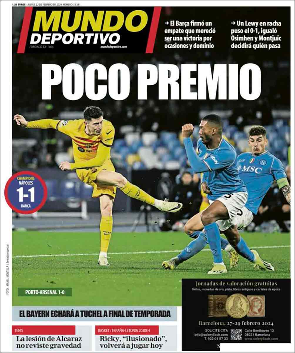 "Poco premio", se lamenta Mundo Deportivo, en la línea plañidera del entrenador de la institución por la que bebe los vientos. Xavi declaró al final del partido que habían jugado divinamente, como siempre, pero que "el marcador no estaba de acuerdo". Hay una larga historia de acritud entre Xavi y el marcador, una que no vamos a descubrir ahora. De todos modos, ¿para qué quiere Xavi que el marcador le dé la razón? A los hombres que se visten por los pies les basta con la satisfacción interior de saberse en lo cierto. No necesitan el refrendo veleidoso de los acontecimientos. Mal, muy mal el marcador no dando la razón a Xavi, pero no es esta la variable que debe incumbirnos. Tanto el Big Data como el Equipo de Opinión Deportiva Sincronizada consideran que el Barça brilló. Pues de eso se trata, hombre, de eso se trata. Poco importa si has mostrado la robustez de un hilillo de moco de alergia a las gramíneas y te ha reventado Osimhen en una ocasión que no era ni ocasión. Cualquiera, absolutamente cualquiera puede hacer daño a un equipo tan radicalmente desprovisto de alma como este Barça. Aunque, en nuestra modestísima opinión, este concepto también entra dentro de lo que se tiene (o debería tenerse) por jugar bien o mal, habrá que asumir qué poquísimo importa nuestra modestísima opinión. ¿Cómo va a importar, si hasta la mismísima Central Lechera (jajajaja) se rinde ante el majestuoso empate culé frente a un equipo que, tal y como jugó ayer, a duras penas se mantendría en la Primera División española?