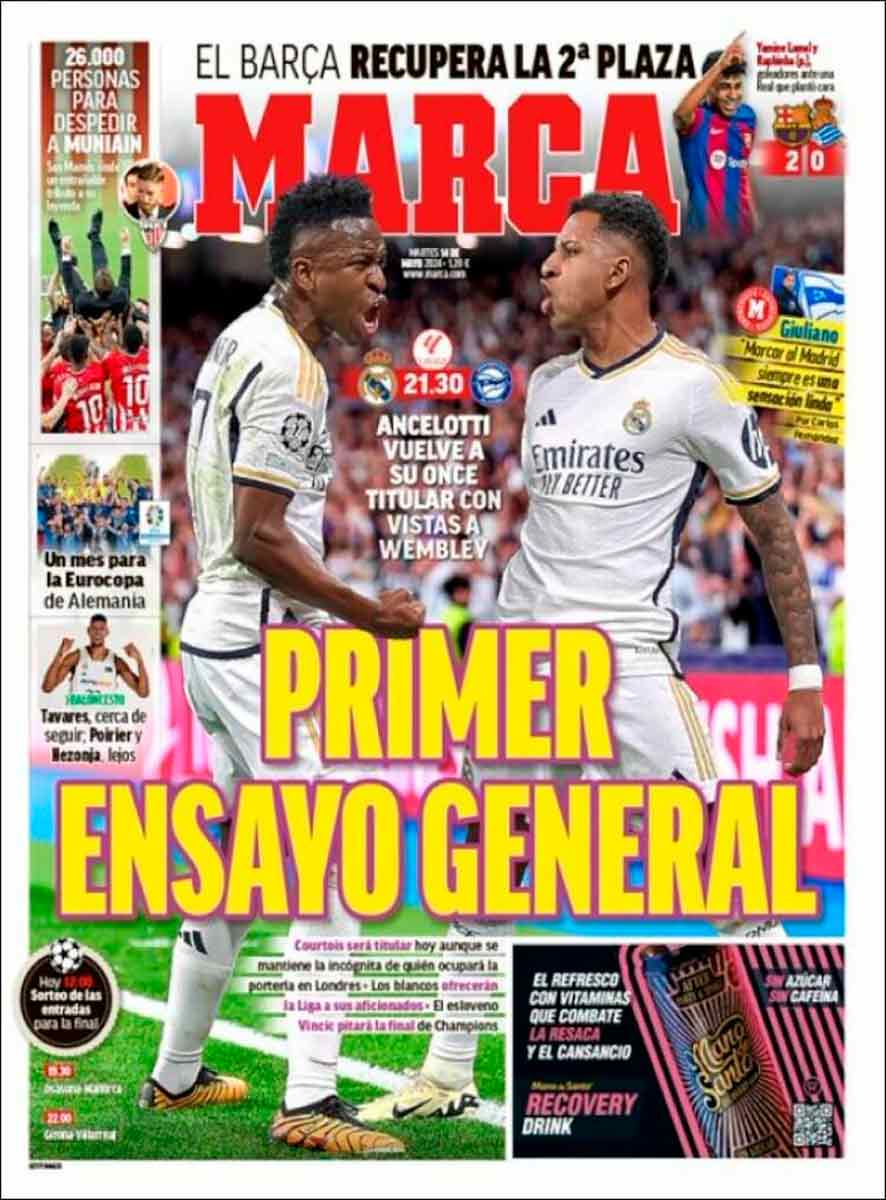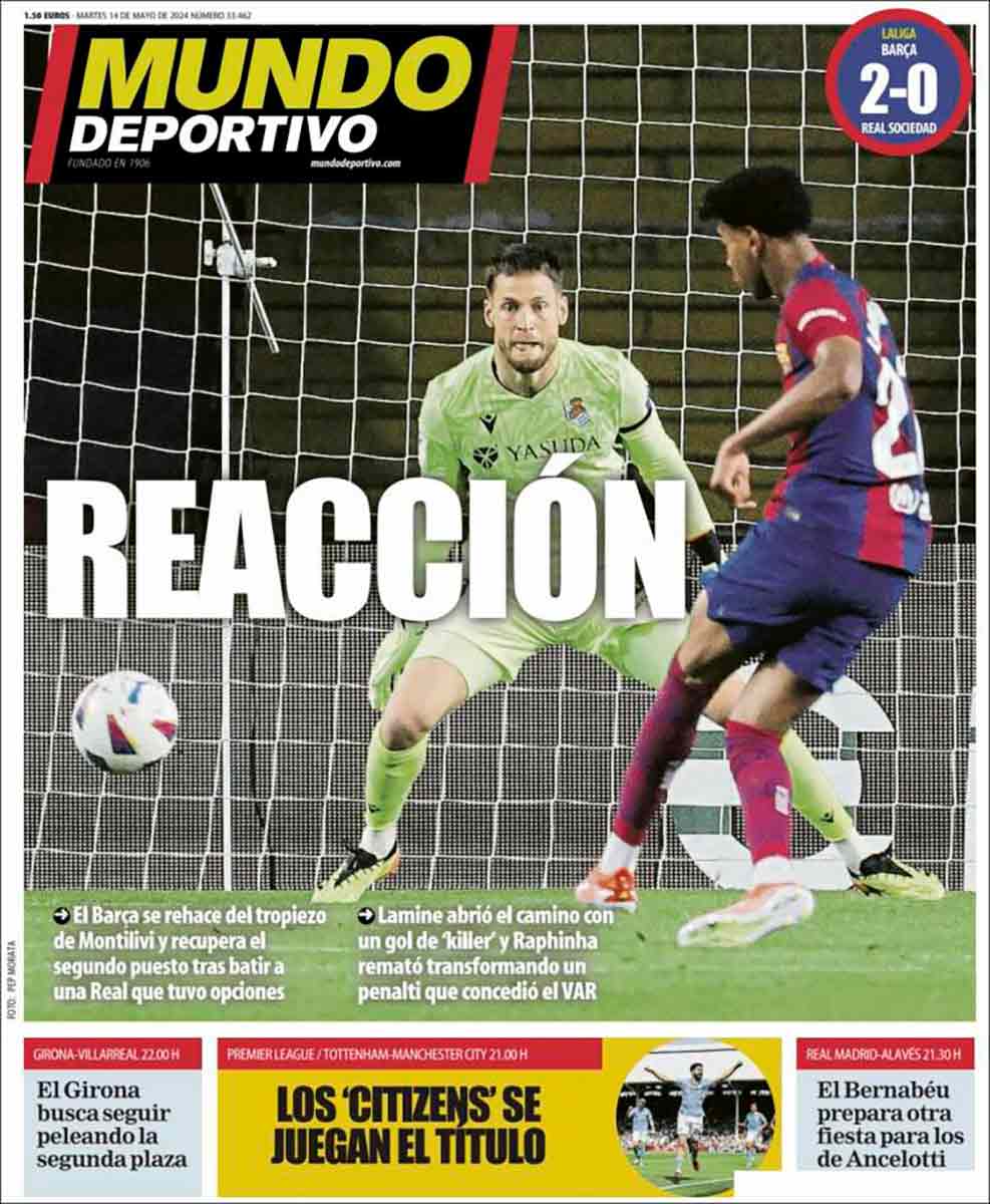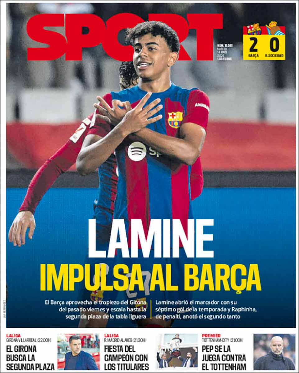 La prensa culé dedica sus primeras planas a Lamine Yamal, máximo responsable junto a la Real de la victoria de ayer y principal sostén de este Barça, recordemos que el brillante futbolista ya lleva la friolera de dos goles más que Güler. Como ya comentamos en La Galerna, si sigue así, el bueno de Lamine acabará en un grande.