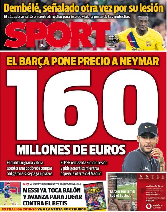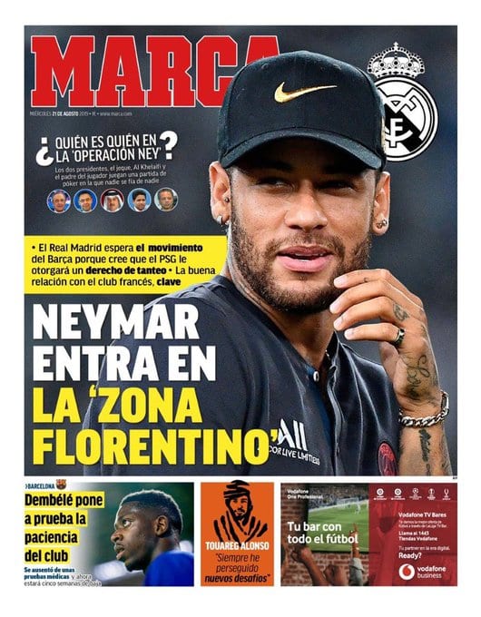 Mientras en 'Mundo Deportivo' nos incitan a ir casi a tiendas de muebles y apreciar el color shamal para una bonita cómoda o una mesa central para el salón, en 'Sport' y 'Marca' modifican la hoja de ruta. Los primeros dicen que la operación se va a los 160 millones de euros -cifra que pone el Barça, ojo, como si Neymar fuera suyo-, mientras que el diario madrileño añade personajes secundarios y advierte de la irrupción de Florentino Pérez en escena. Lo mejor de la primera página de 'Marca' es que por fin podemos ver a 'Papá Ney'. No hay cierre de culebrón sin que él muestre sus cartas. Ya era hora.