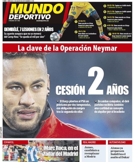 Buenos días. La ingeniería negocial del Barcelona está a punto de elevar su nivel con el fin de concretar la llegada de Neymar al Camp Nou. Tras intentar meter con calzador en la operación a gente como Coutinho -cedido al Bayern y sin ganas de volver-, Rakitic -ya si es mejor otro año- o Dembélé -lesionado y echando siestas en el aeropuerto-, la solución podría pasar por afrontar la negociación desde 'Idealista', un portal inmobiliario que serviría de trampolín para alcanzar un feliz desenlace. Lo entenderéis tras ver la portada de 'Mundo Deportivo'.