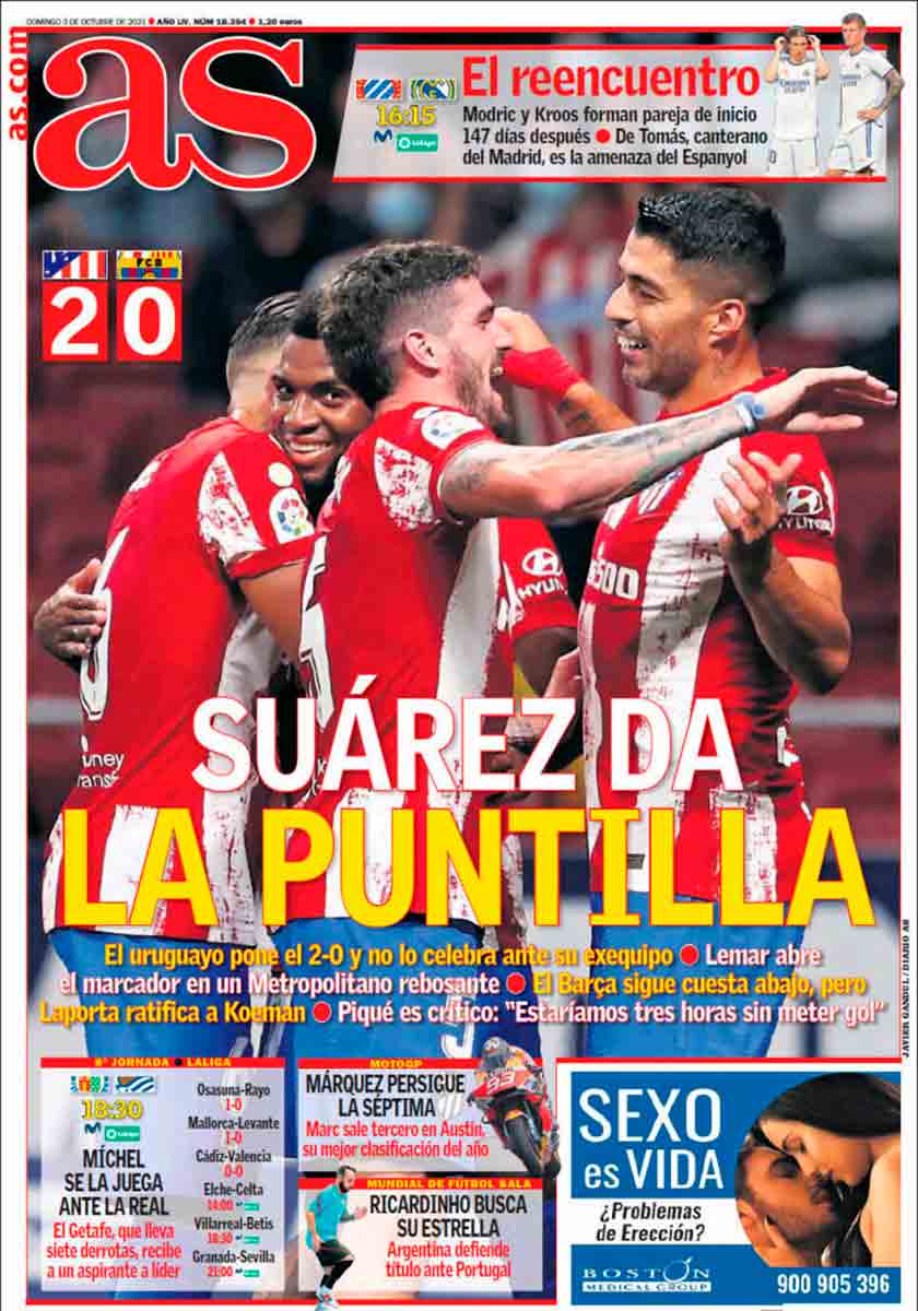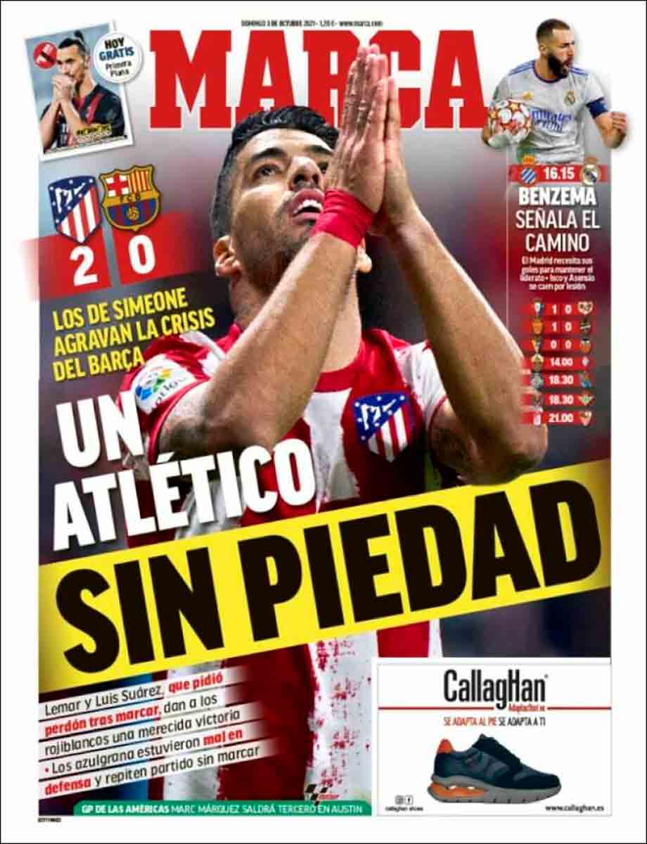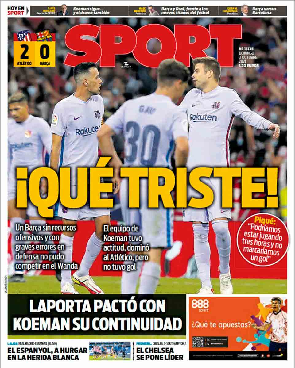 Sorprendentemente, la portada de Sport es bastante sensata y fiel a la realidad. “¡Qué triste!” es su titular. Después, el letras más pequeñas, dicen que el Barça no tiene recursos ofensivos y cometió graves errores defensivos que le impidió competir frente al Atlético. También recoge las declaraciones de Piqué: “Podríamos estar jugando tres horas y no marcaríamos un gol”. En ellas, el humilde central catalán hace hincapié en lo romo del ataqué culé, pero no en lo que a él le compete, la seguridad defensiva, solo sostenida a duras penas por Araújo.