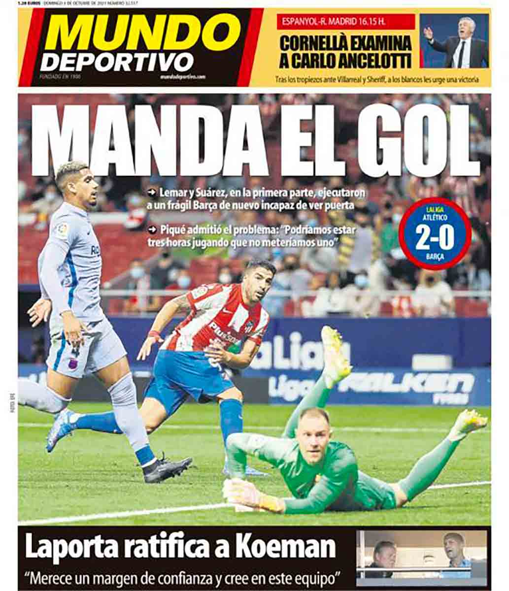 Aunque Sport también dice que el Barcelona tuvo actitud, dominó al Atlético, pero no tuvo gol. Y esto entronca con la portada de Mundo Deportivo