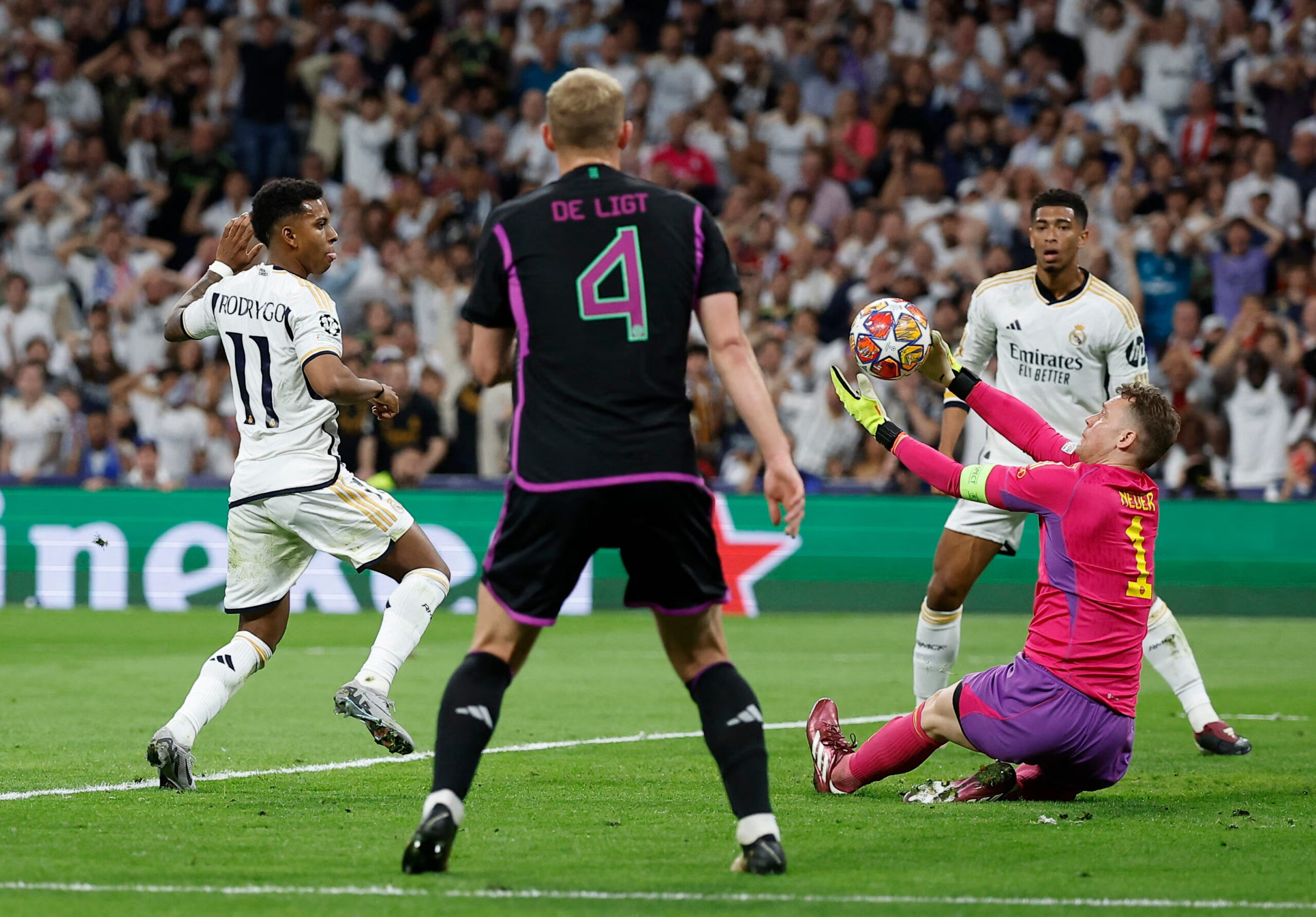 Una seña de identidad del técnico belga. La presión es una de sus características como técnico y una de las razones por las que el Bayern vuelve a ser una máquina de ganar. La agresividad, intensidad y vehemencia que pone todo el equipo empezando por los delanteros es fantástica por el estilo coral que demuestran. En muchas ocasiones roban el balón o generan pérdidas muy peligrosas cerca del área que acaban con ocasiones claras o goles. Kimmich es el que tira del equipo de arriba para meterlo prácticamente en el área rival y la defensa se sitúa en el mediocampo, llegando a perseguir a los delanteros rivales hasta límites insospechados con la clara idea de que no puedan darse la vuelta. El papel del Real Madrid en la salida será fundamental para saltar la primera línea con ayuda de los mediocampistas. Si se logra superar la presión las posibilidades de hacer daño en transiciones a los teutones será muy alta, ya que el ataque será un cara a cara con los centrales, dándose situaciones de 2 vs 2 o 3 vs 3. Es una de las formas de hacer daño al equipo bávaro.