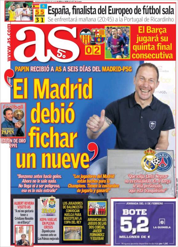 Por lo demás, la portada de As consiste en una entrevista con la persona que han encontrado en Francia dispuesta a poner a parir al Madrid (es Papin, pero podría haber sido un vecino de un sobrino nieto de Edith Piaf). Qué raro que no le hayan preguntado a Papin por la polémica del Bernabéu y la Final.