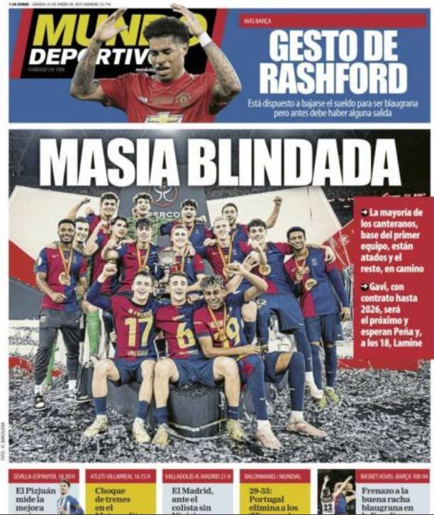 ¿Se pueden decir dos mentiras en un titular de solo dos palabras? Se puede, ya lo han visto. Ni todo es Masía, donde “se apropian” hasta de los fichajes, ni mucho menos está “blindada”, salvo por las cautelares y las palancas impagadas. Por cierto, Mundo Deportivo demanda un “gesto de Rashford” y este, en sus ademanes, parece pedir que le dejen en paz. Que le gusta cobrar a final de mes y que no lo presionen para que se largue a mitad de temporada si no le gusta al entrenador de turno.