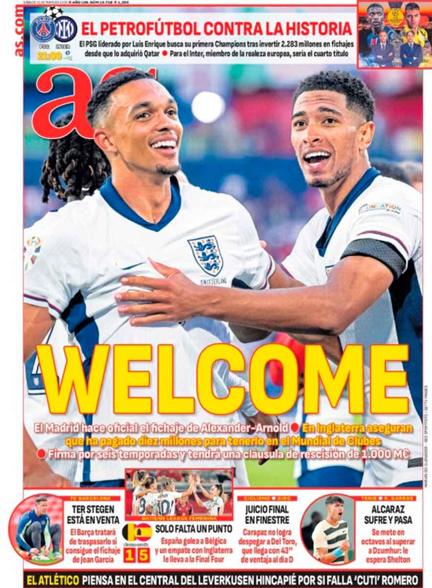 El diario As prefiere escoger la camiseta de la selección inglesa para su portada en lugar de la del Real Madrid, y muestra la dupla que formará Alexander-Arnold con Jude Bellingham, mientras despacha el fichaje con un escueto “Welcome”. No se aprecian grandes elogios a sus virtudes, pero sí un dato que circuló ayer, los 10 millones de euros que se supone que el Real Madrid ha abonado para anticipar su llegada. Será nuestro 10 Million dollar baby, y bien que lo disfrutaremos. Otros tienen su 19,3 million dollar daddy y nosotros, a nuestro Cazador blanco, corazón negro.