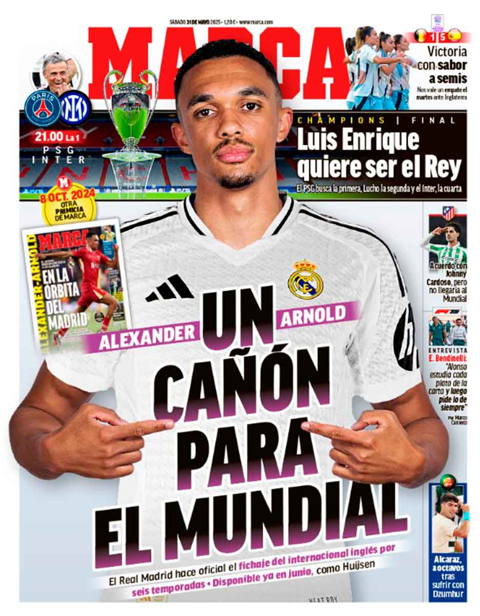 El habitual acierto de Alexander-Arnold con ambas piernas contrasta con el tanto que se apunta el diario Marca en su portada: “Otra primicia de Marca”, indican, y fechan su anuncio en octubre de 2024. Convendría recordarles que hasta un reloj parado acierta dos veces al día. O que, al contrario que sucede con un tirador de élite, lo de la prensa deportiva se asemeja más a un tipo con una ametralladora que, de tanto disparar en todas las direcciones, termina acertando a alguien.