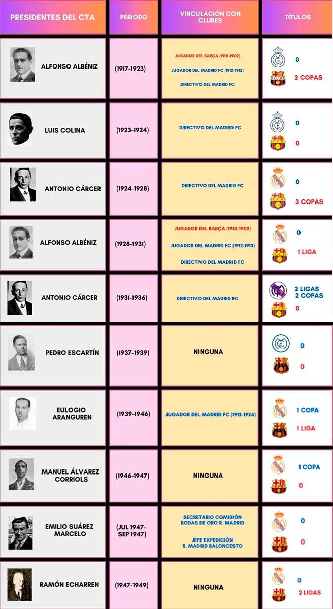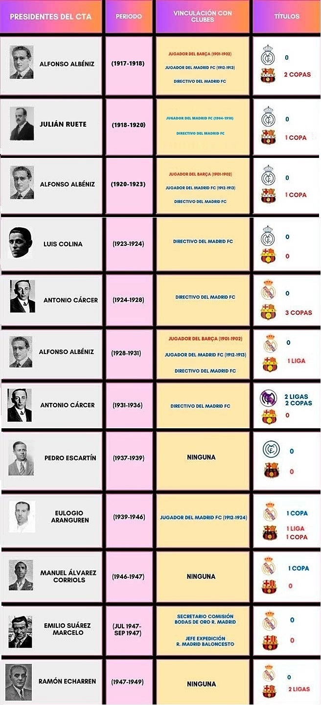 A continuación, las tablas con cada presidente del CTA, el periodo durante el cual ejerció el cargo, su vinculación con clubes y los títulos obtenidos por Real Madrid y Barcelona durante su presidencia. Infografía por cortesía de Kollins: