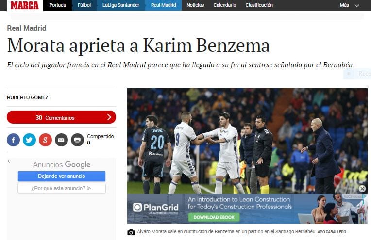 Benzema es el 9 indiscutible, nos cuenta Marca. Nos informa de que el galo ha completado su undécima temporada al frente del ataque madridista, un registro que no se alcanzaba desde la época de Santillana. Y eso es mucho decir, es compararlo con la Historia y poner a Karim por fin en su sitio, aunque quizás el adjetivo empleado (“indiscutible”) sea fruto de la canícula y el agotamiento cerebral de los redactores, puesto que durante años se le trató con cierta frialdad: