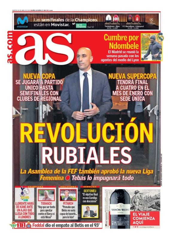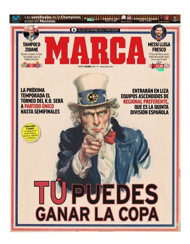 Nosotros hoy hemos venido aquí a decir que Klopp tiene razón en esto que ha dicho del Camp Nou, pero no podemos evitar que el resto de periódicos del día quieran hablar de otras cosas: una análisis de la mencionada semifinal entre Liverpool y Barça, una llamada a filas del tío Sam para que la Cultural Leonesa gane la Copa y un intento de mitificación de la figura de Rubiales que tiene menos posibilidades de éxito que la desmitificación emprendida por Klopp respeto al Camp Nou.