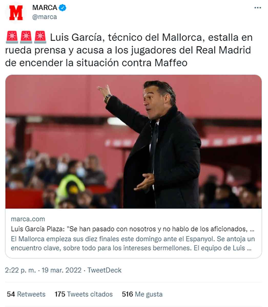Buenos días, amigos. Real Madrid y Barcelona se enfrentan a las 21 horas en el estadio Santiago Bernabéu. Hoy es día de clásico y ayer, día del clásico bocazas: Luis García Plaza. Si no sabéis quién es, se trata del actual entrenador del Mallorca. Un exfutbolista del Atlético de Madrid “B” (el mismo equipo donde militan jugadores caníbales que se dedican a morder la cabeza a Vinícius) y del Benidorm. Su mayor gesta deportiva fue el ascenso a Segunda División B con el equipo alicantino, no sabemos si celebraría tamaña hazaña en la playa de Levante o en la de Poniente. Pues bien, este sujeto, quizá llevado por el odio africano que debe recorrer sus venas, ayer acusó en Marca a los jugadores del Madrid de encender la situación contra Maffeo. Maffeo, sí, ese defensa del Mallorca que no le voló la rodilla a Vinícius de puro milagro.